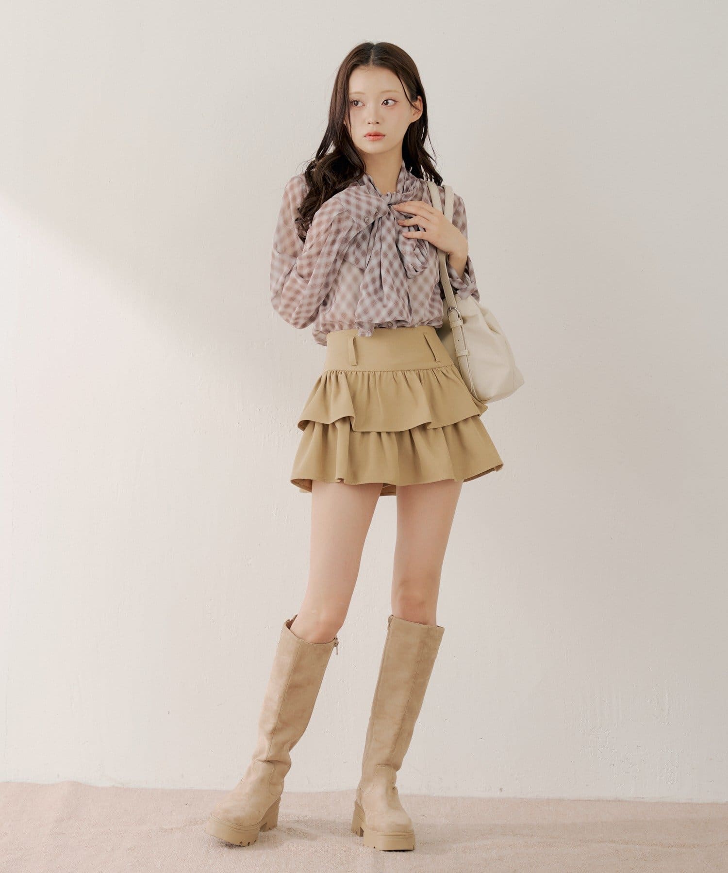 ・軽やかなティアードが、フェミニンな印象を与えつつ、気になる太もも周りをカバー。