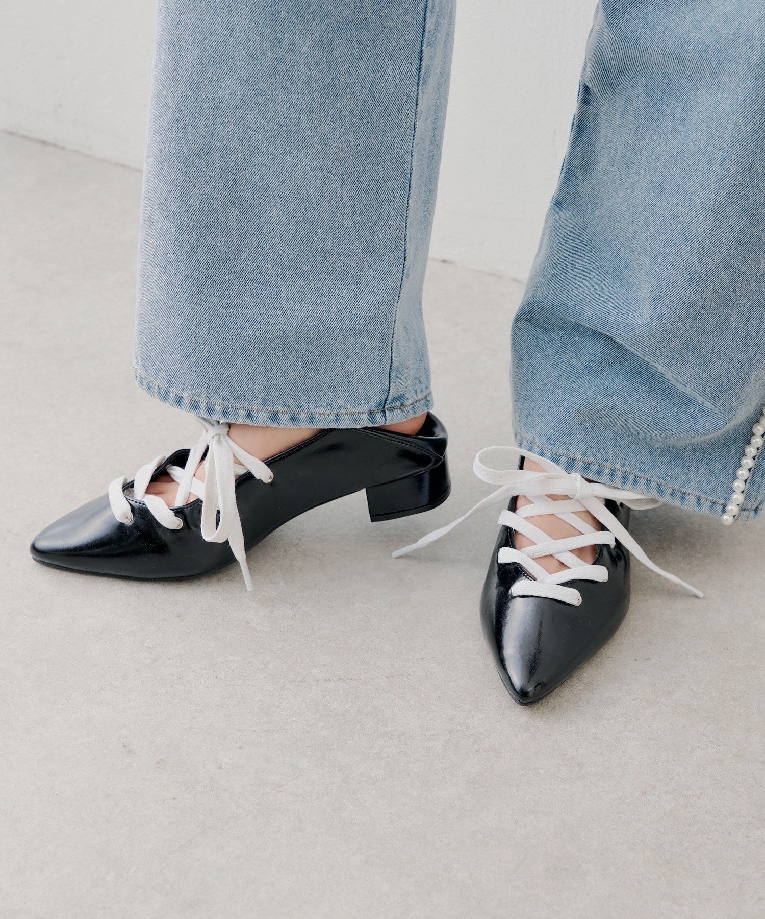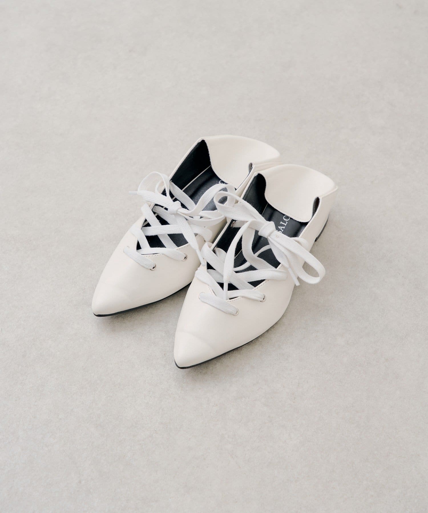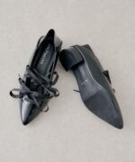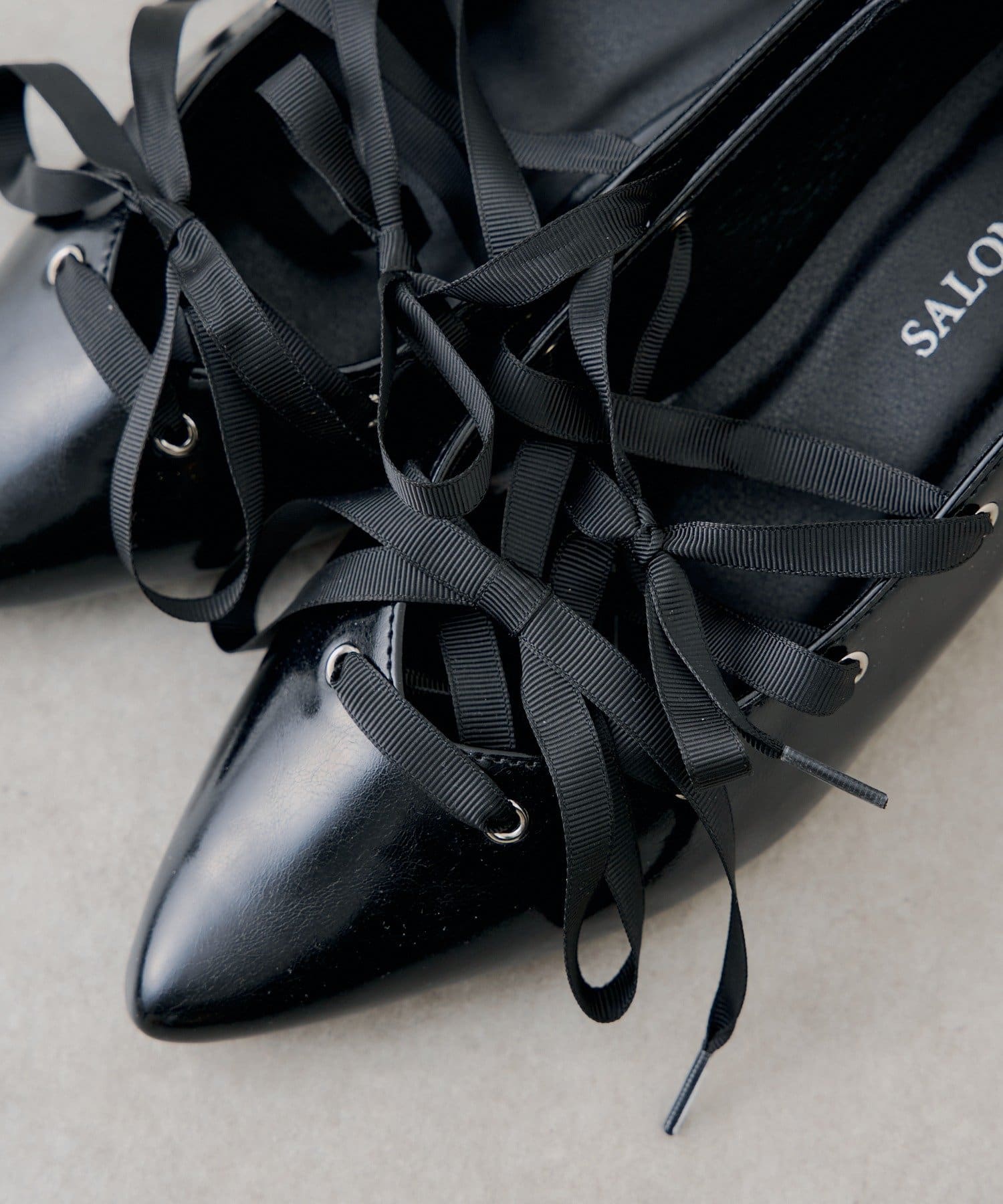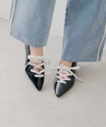 レースアップデザインが目を惹く、女性らしいポインテッドトゥシューズ。