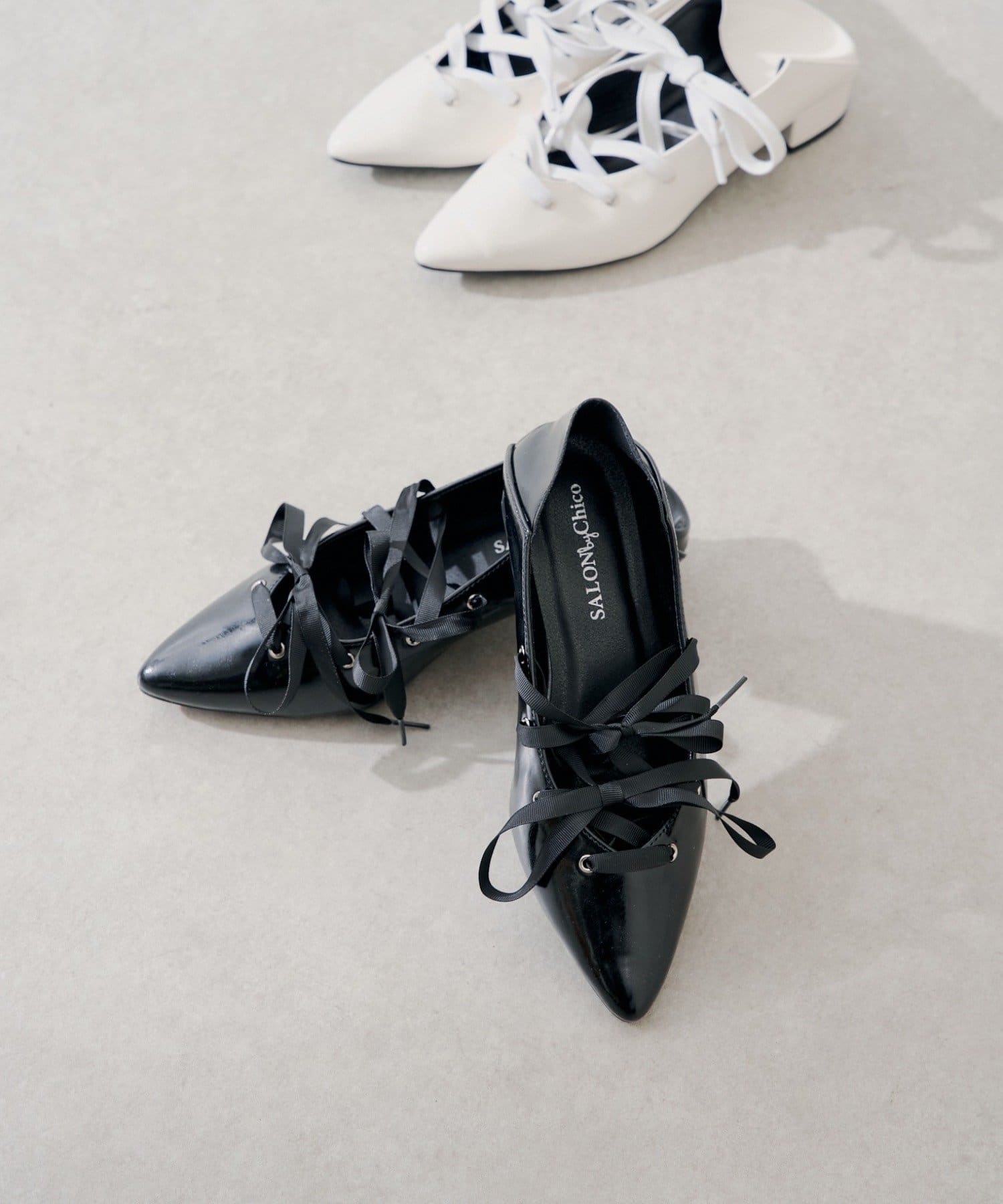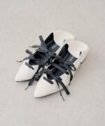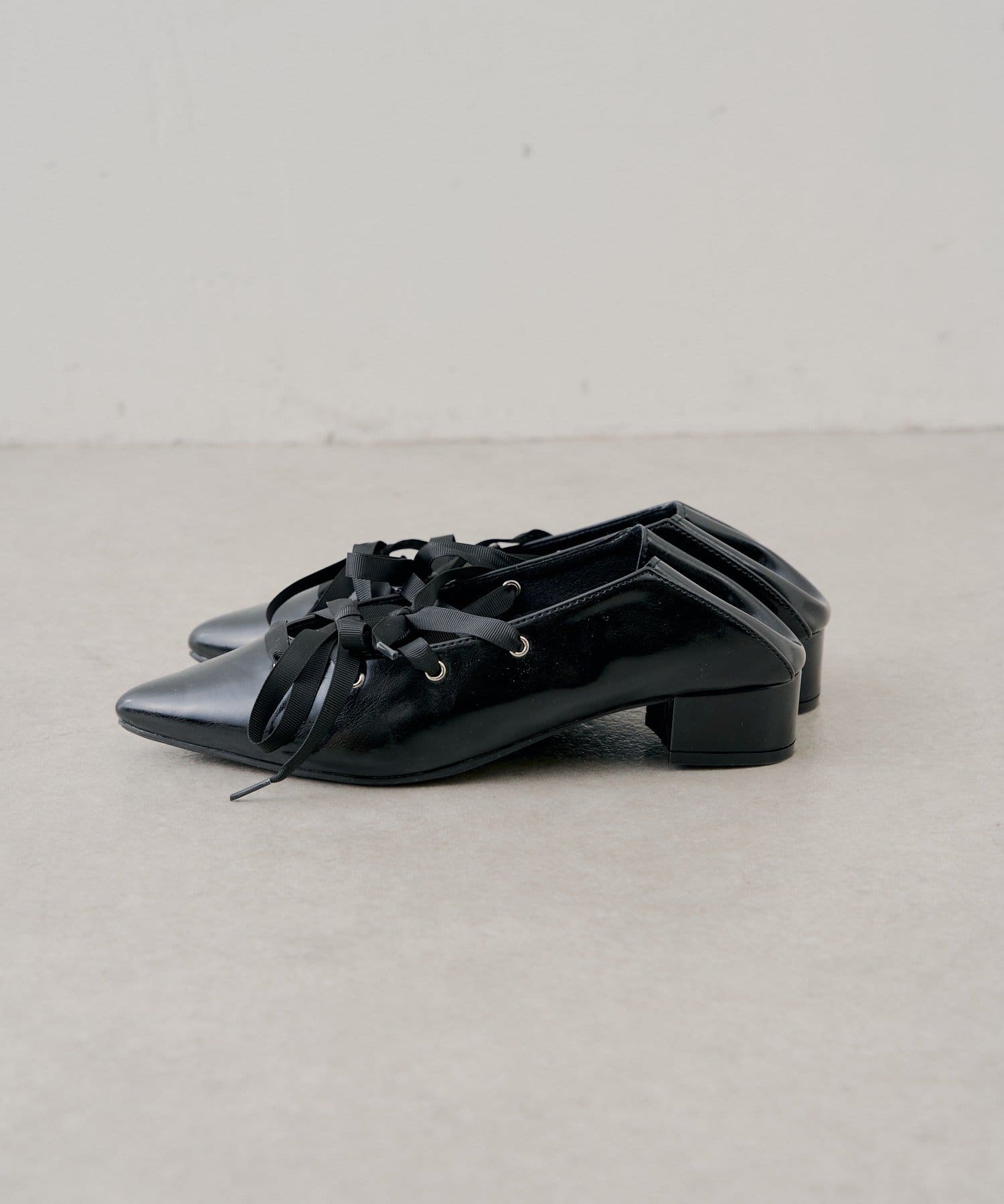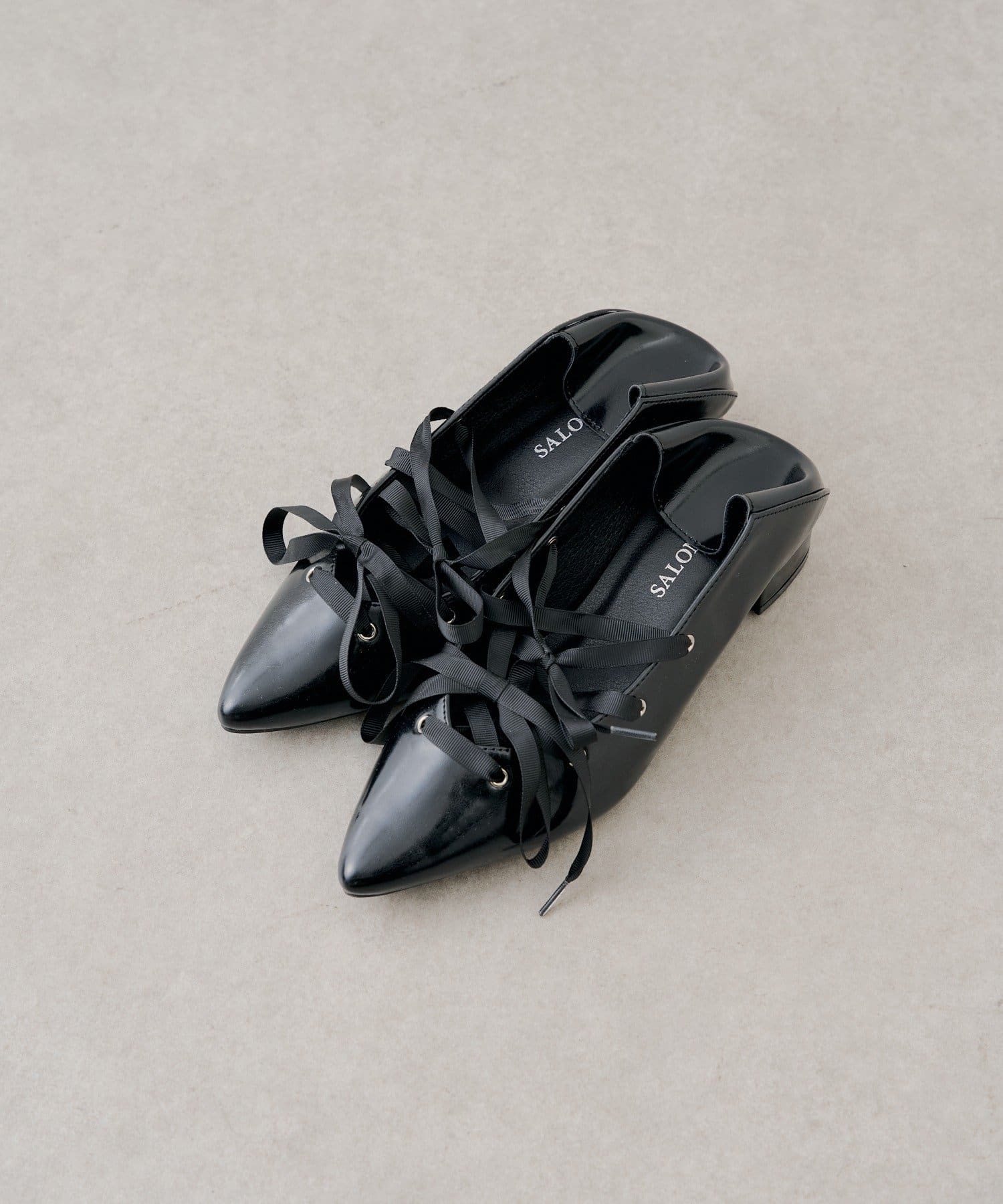 レースアップデザインが目を惹く、女性らしいポインテッドトゥシューズ。