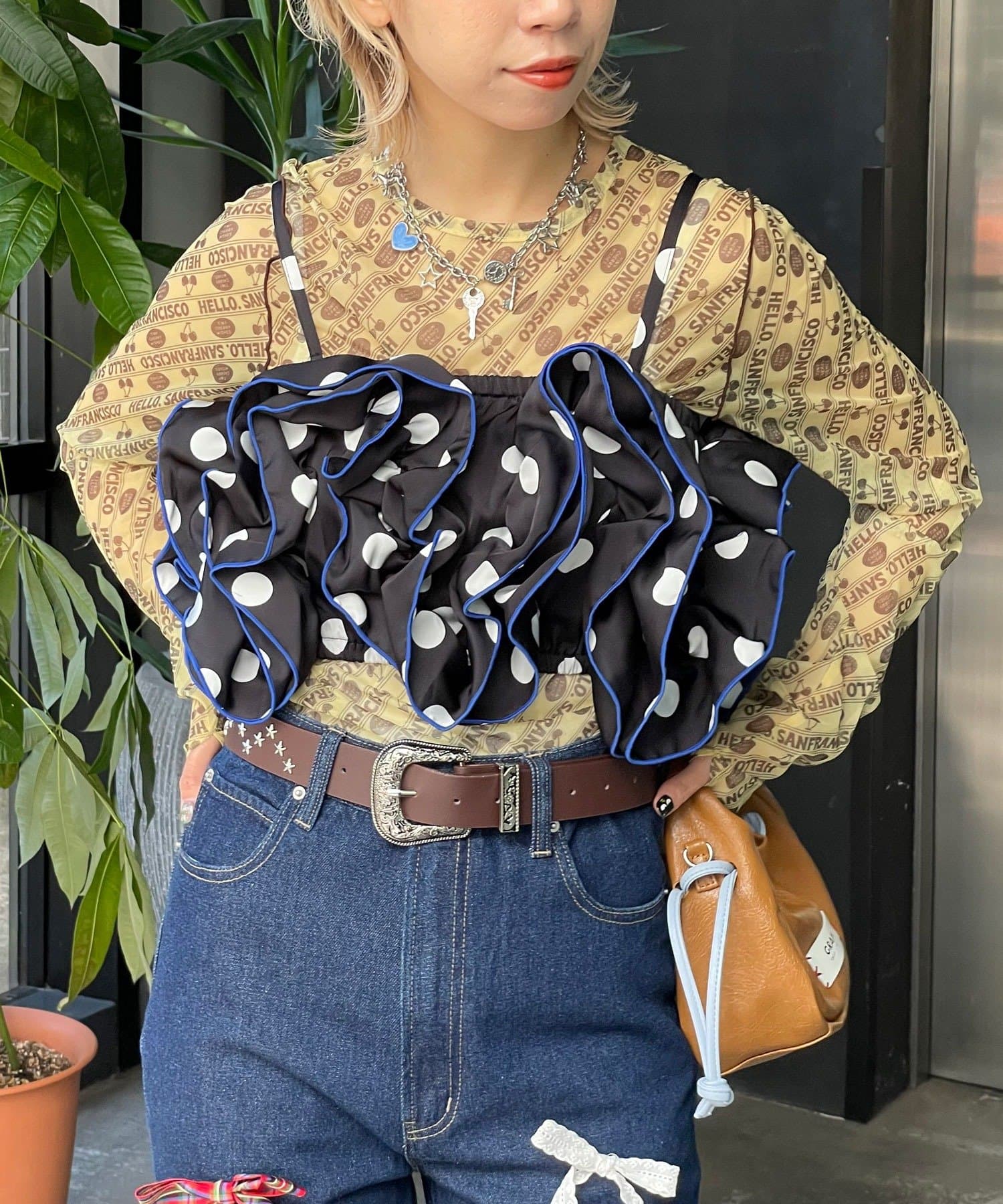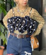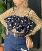 目を引くドット柄に、ボリュームたっぷりのフリルを重ねた主役級ビスチェ。