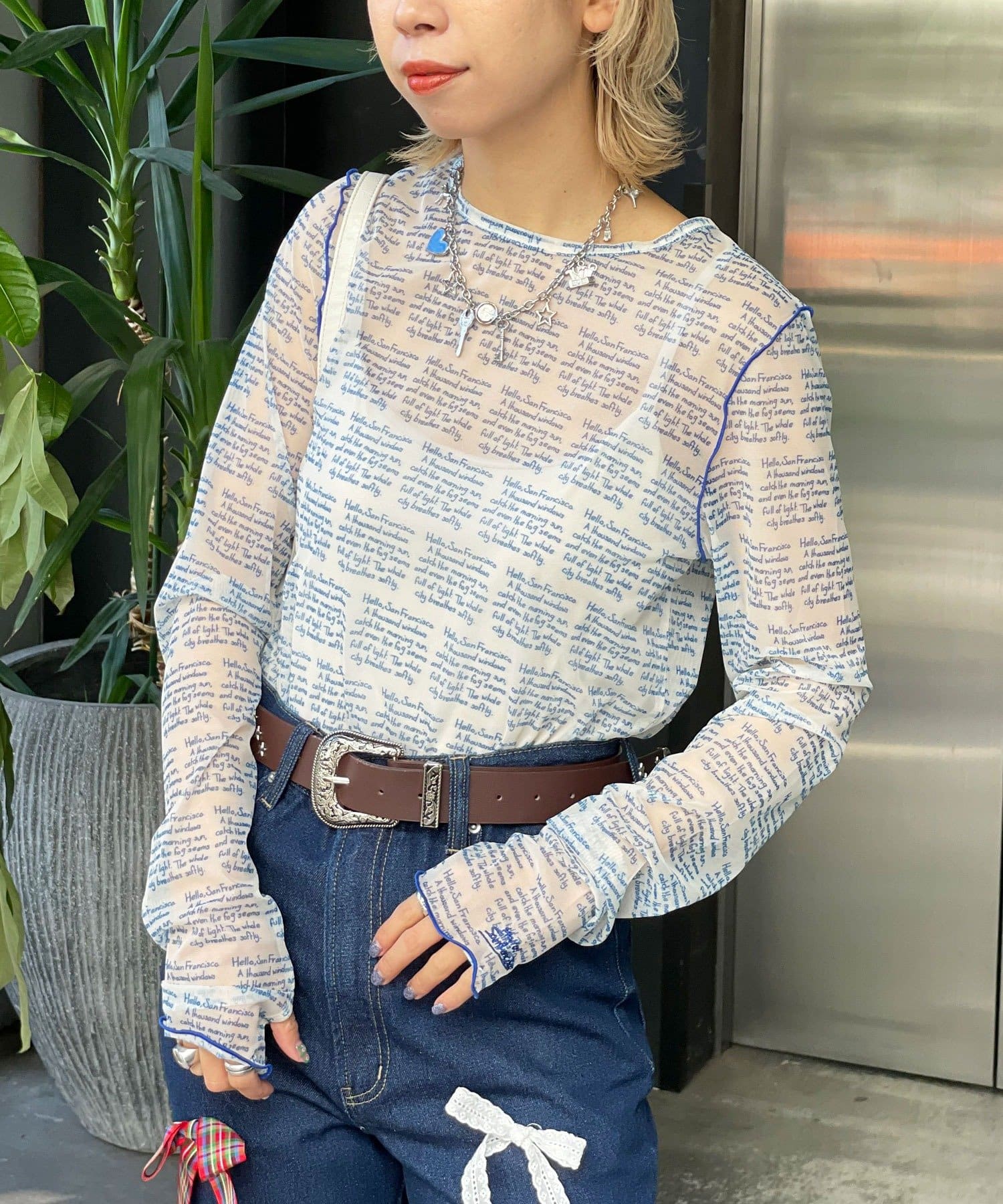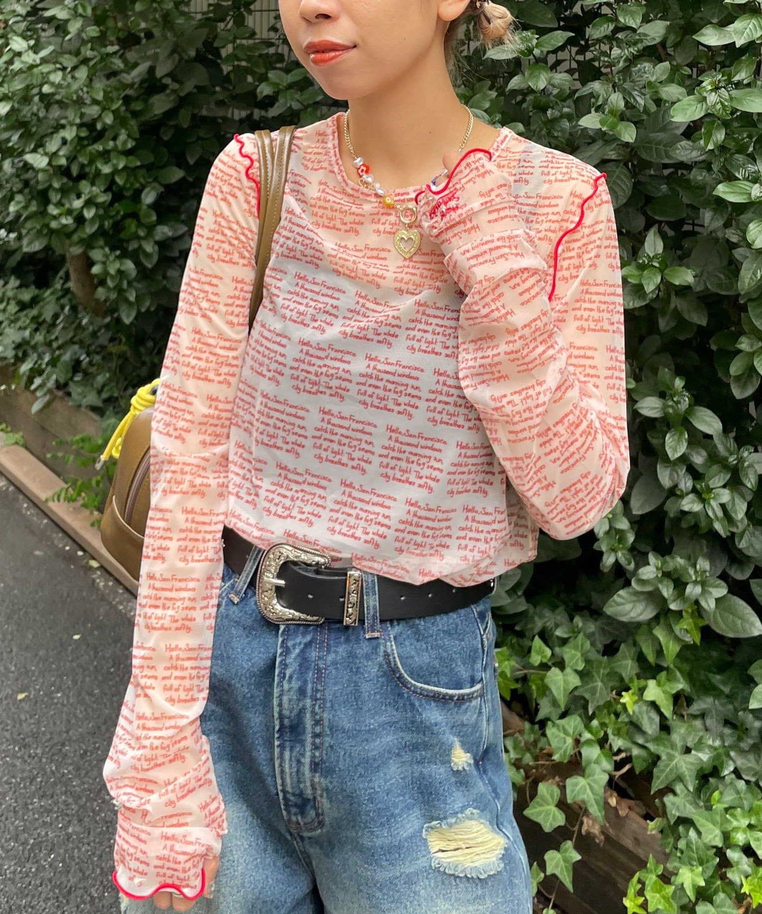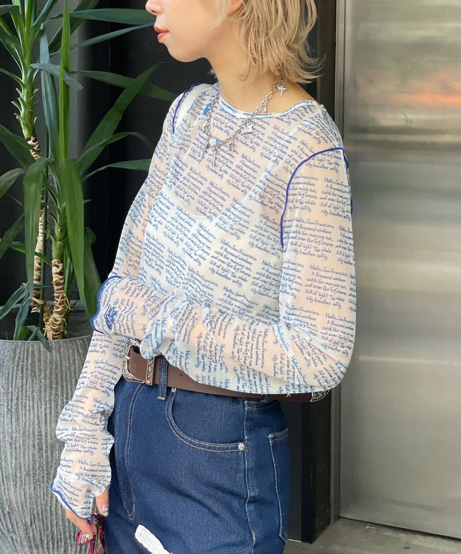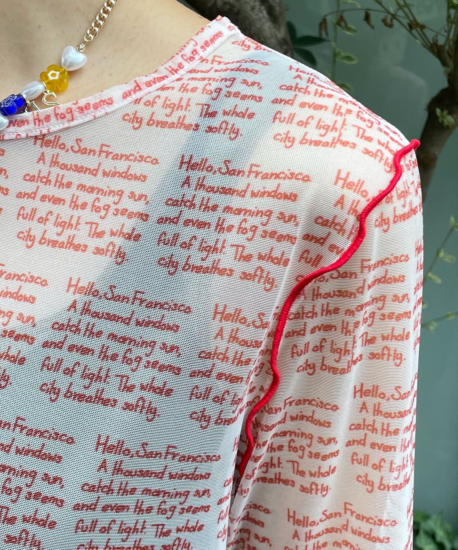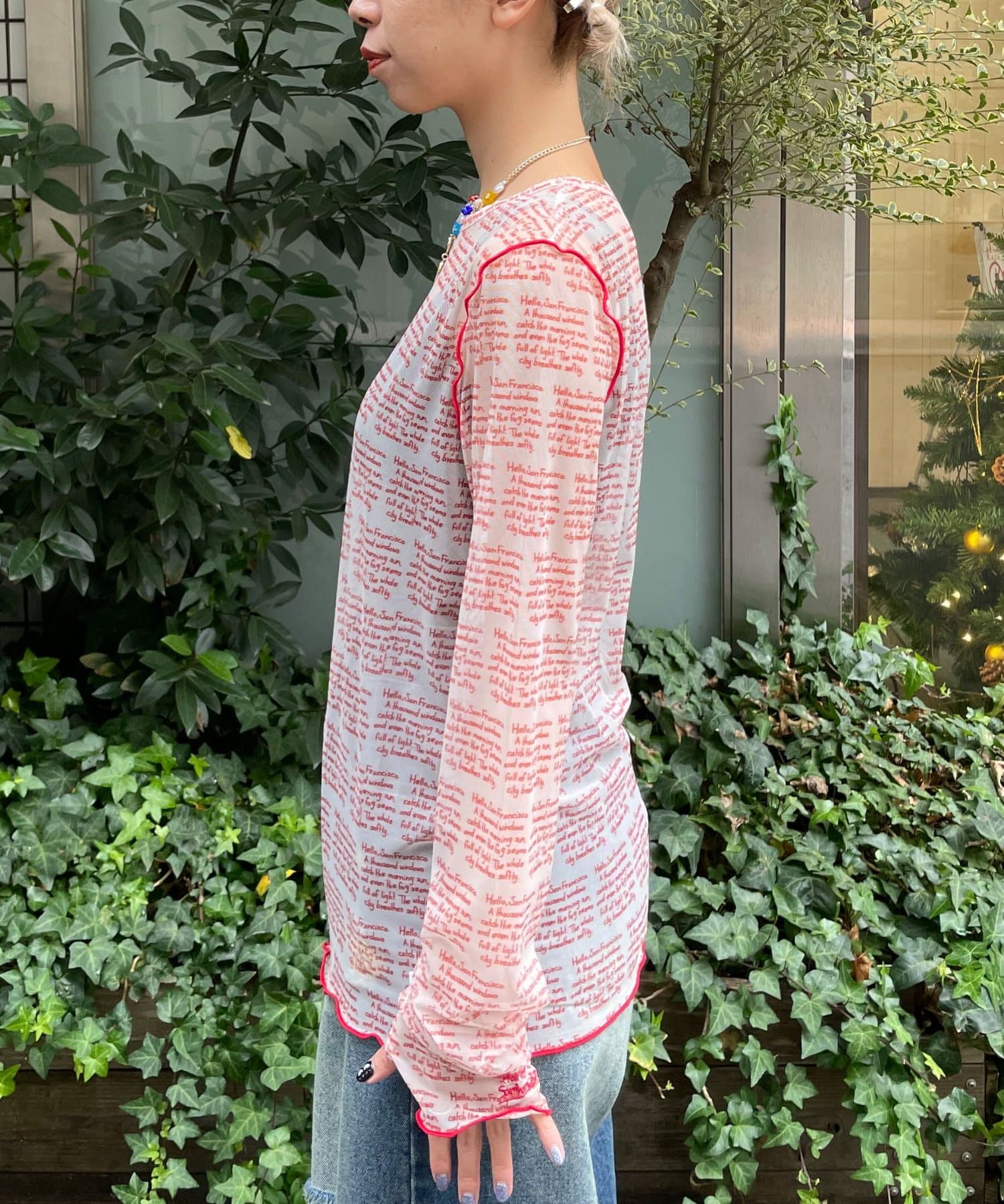全面に施されたメッセージプリントと、縁取りのメロー仕上げがポイントのシアートップス。