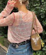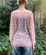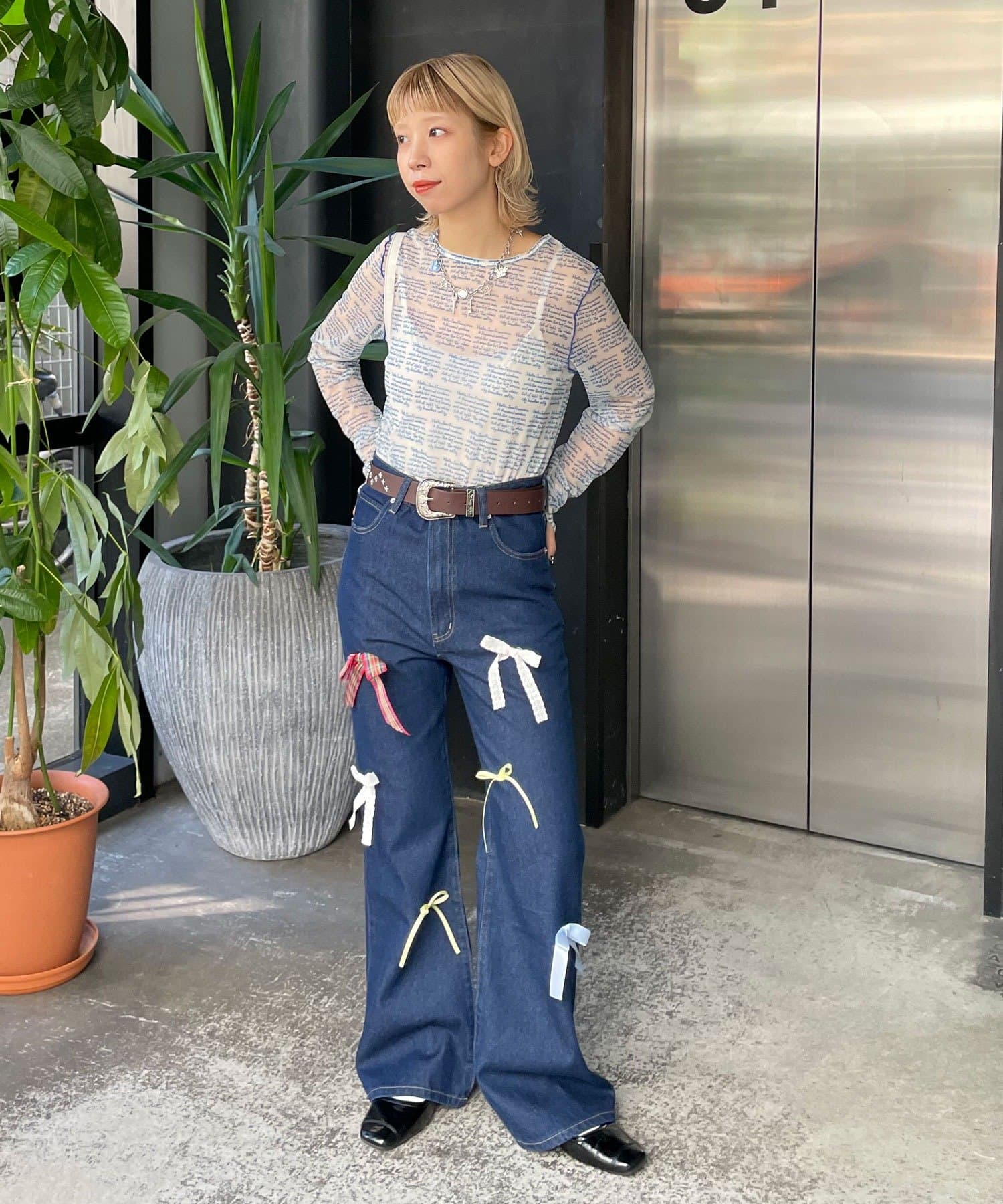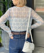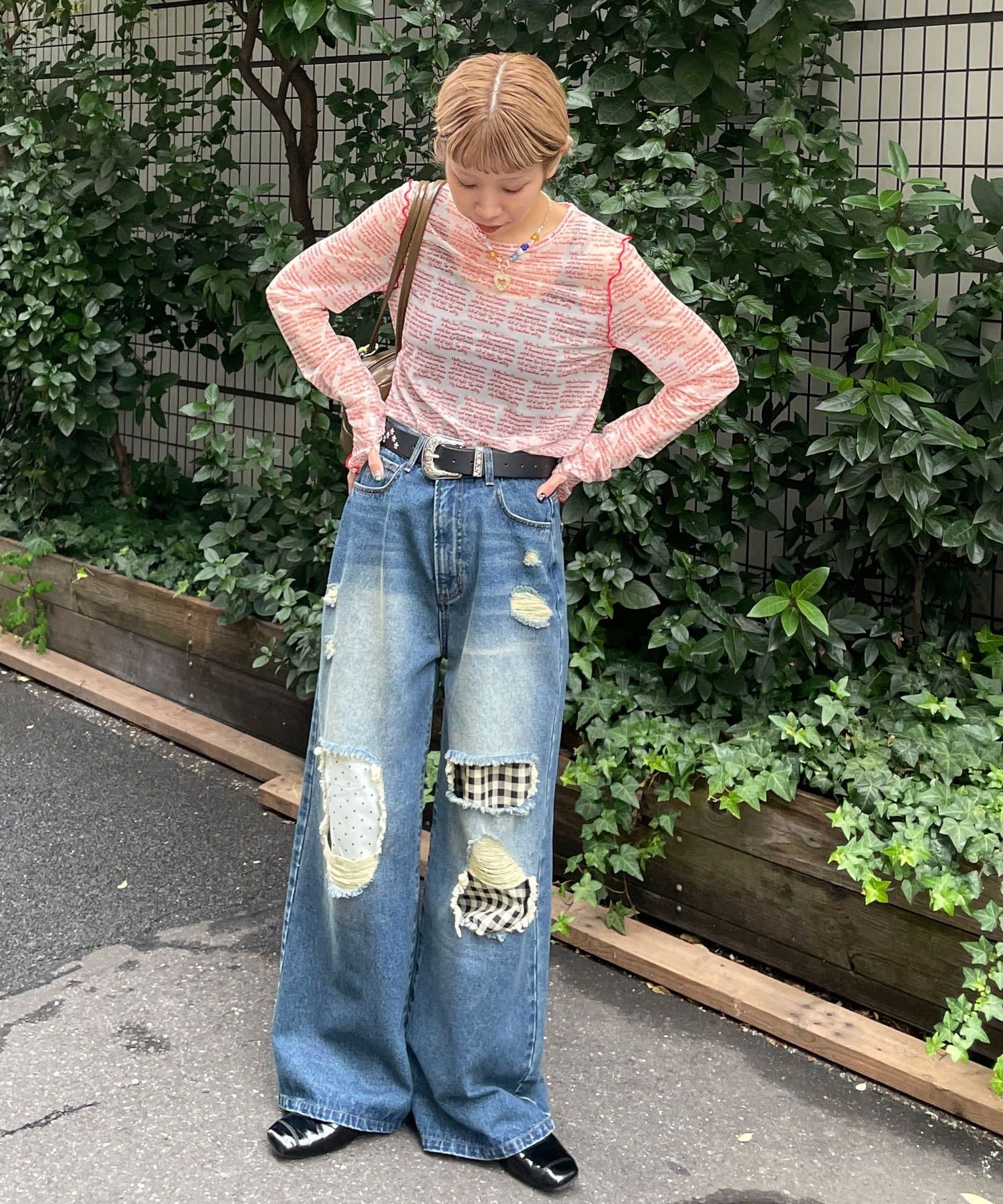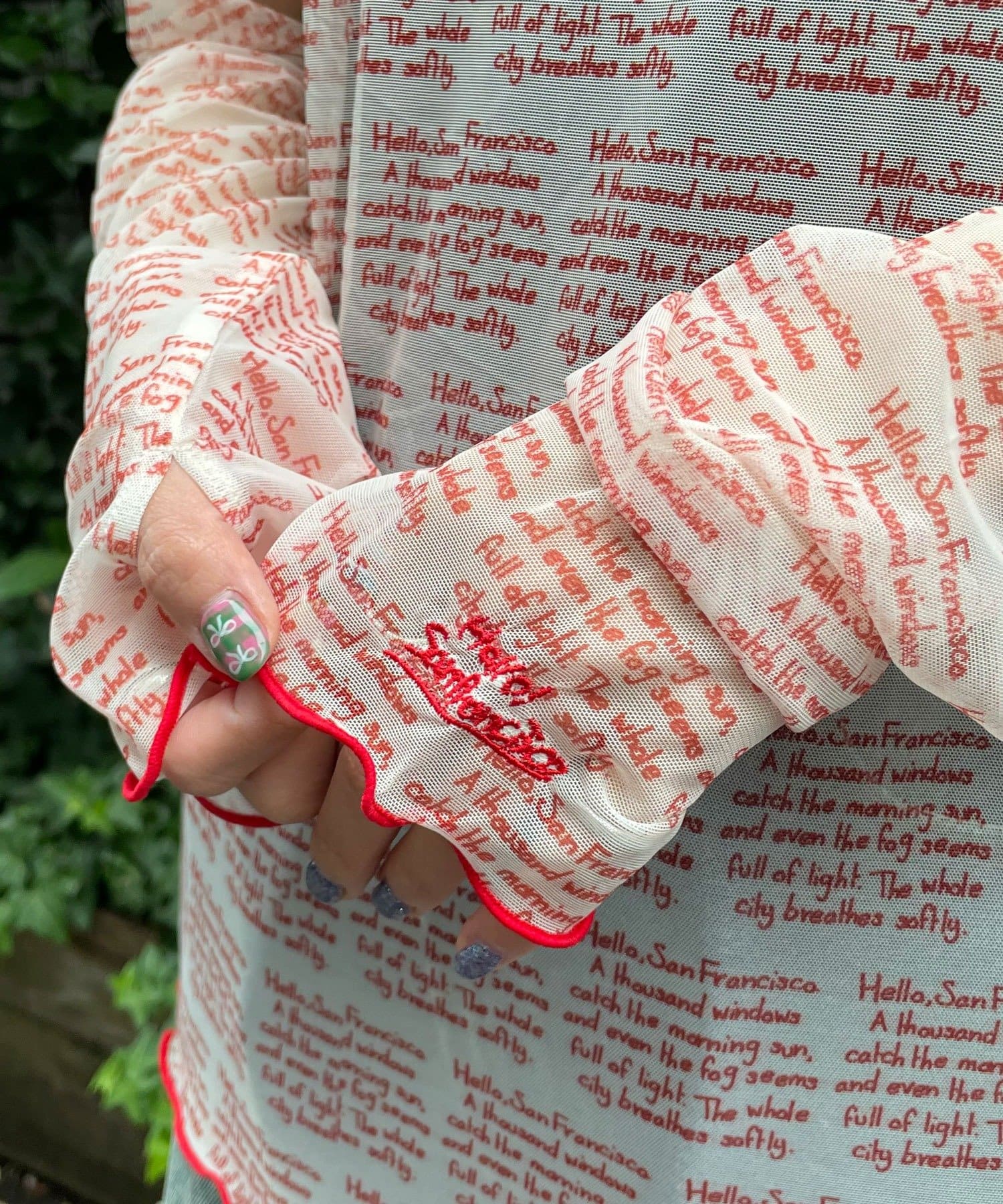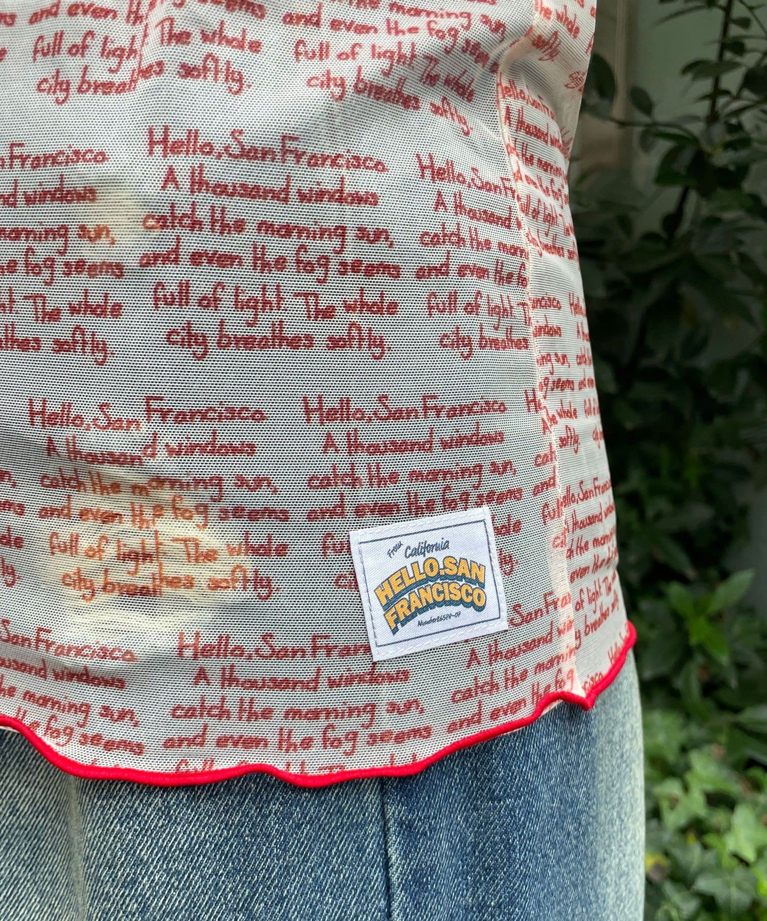 全面に施されたメッセージプリントと、縁取りのメロー仕上げがポイントのシアートップス。