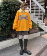 ロゴを前にしてシアートップスを忍ばせれば、最旬のレイヤードスタイルが完成。