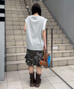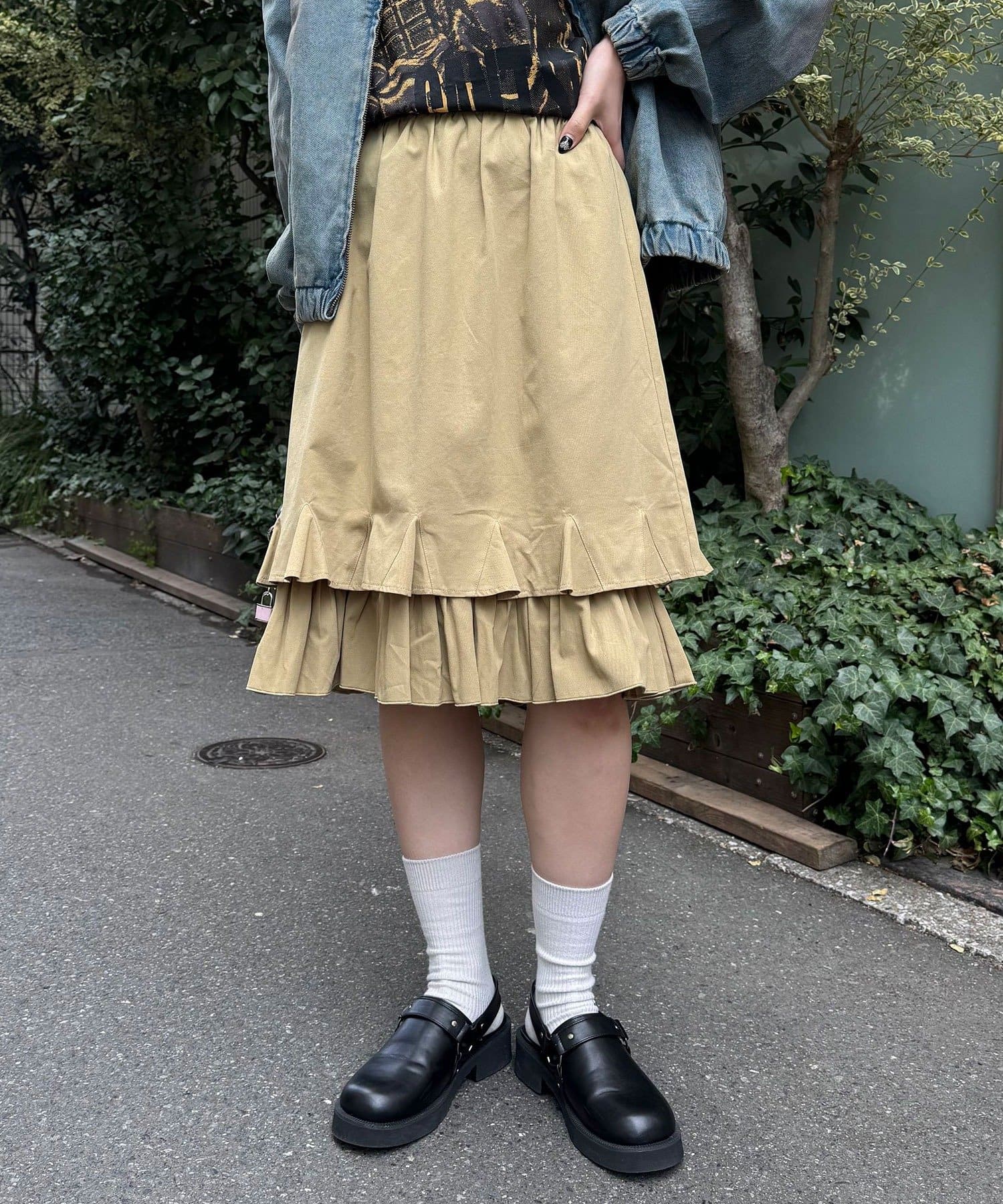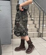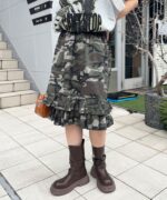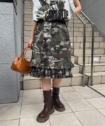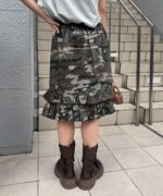 カモフラ柄やワーク素材のタフな印象に、裾のフリルでボリュームを添えたミドルスカート。