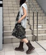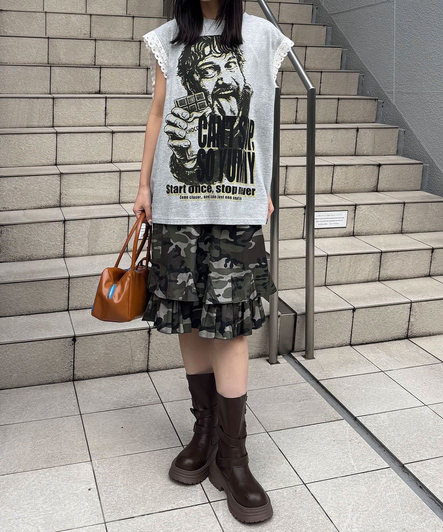 オーバーサイズのTシャツや重めのブーツを合わせると、フリルの甘さが引き立つ好バランスに。