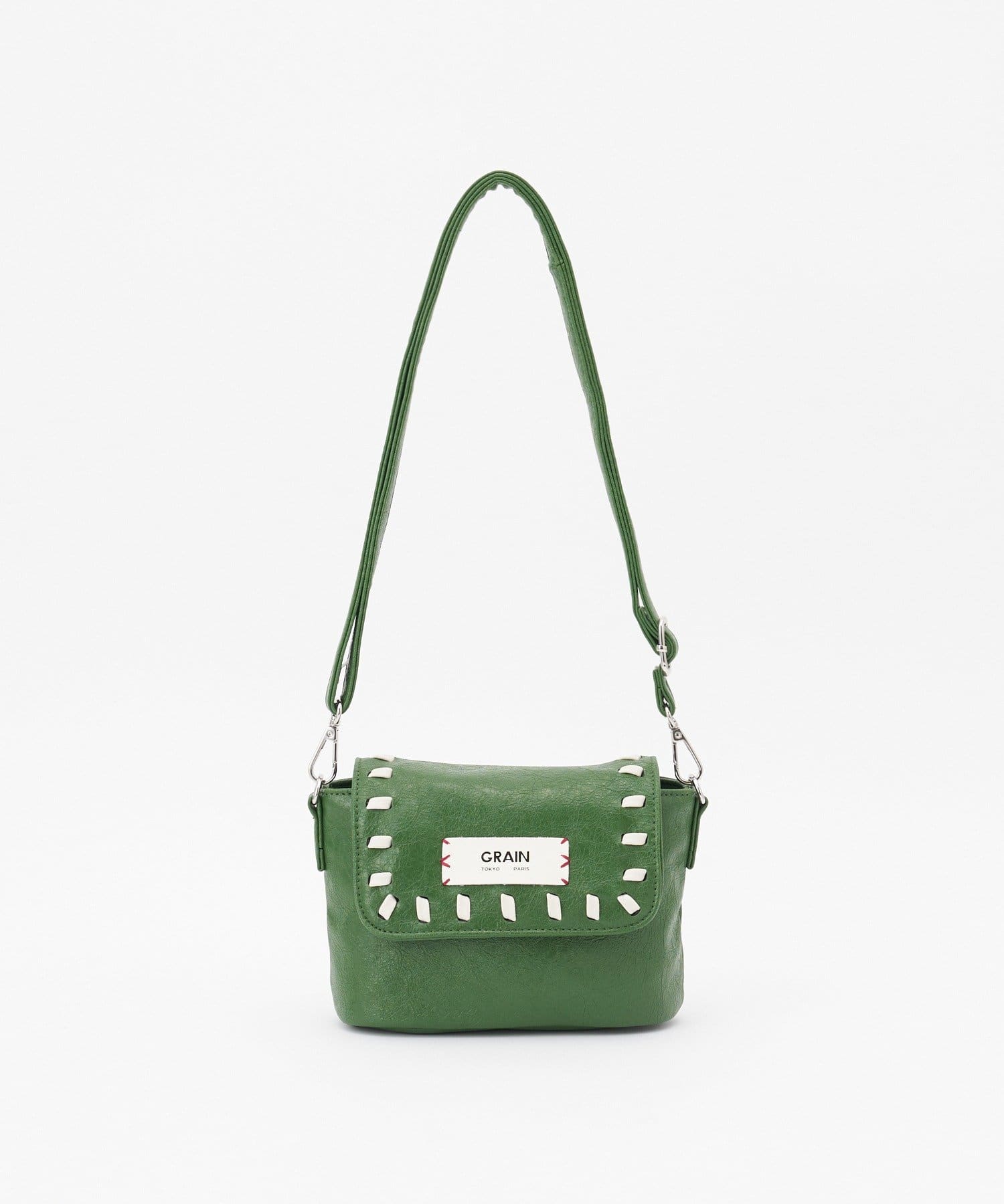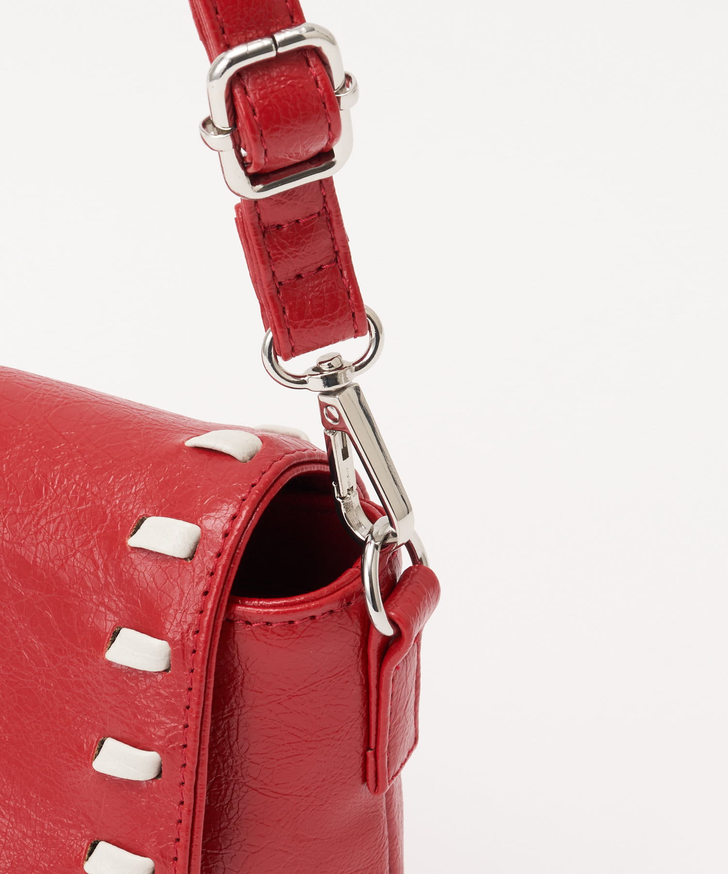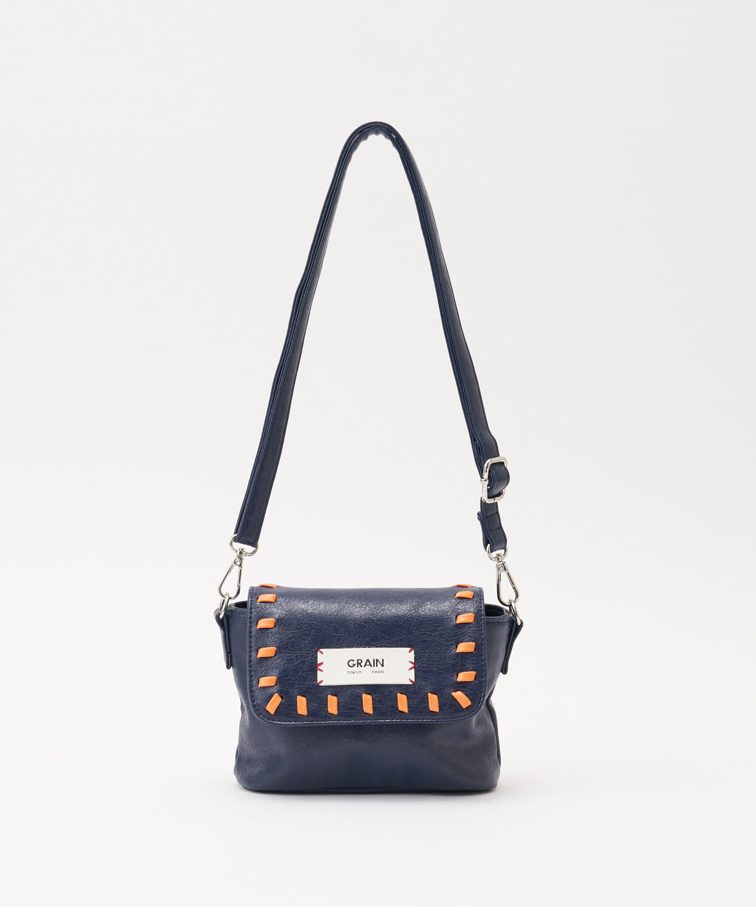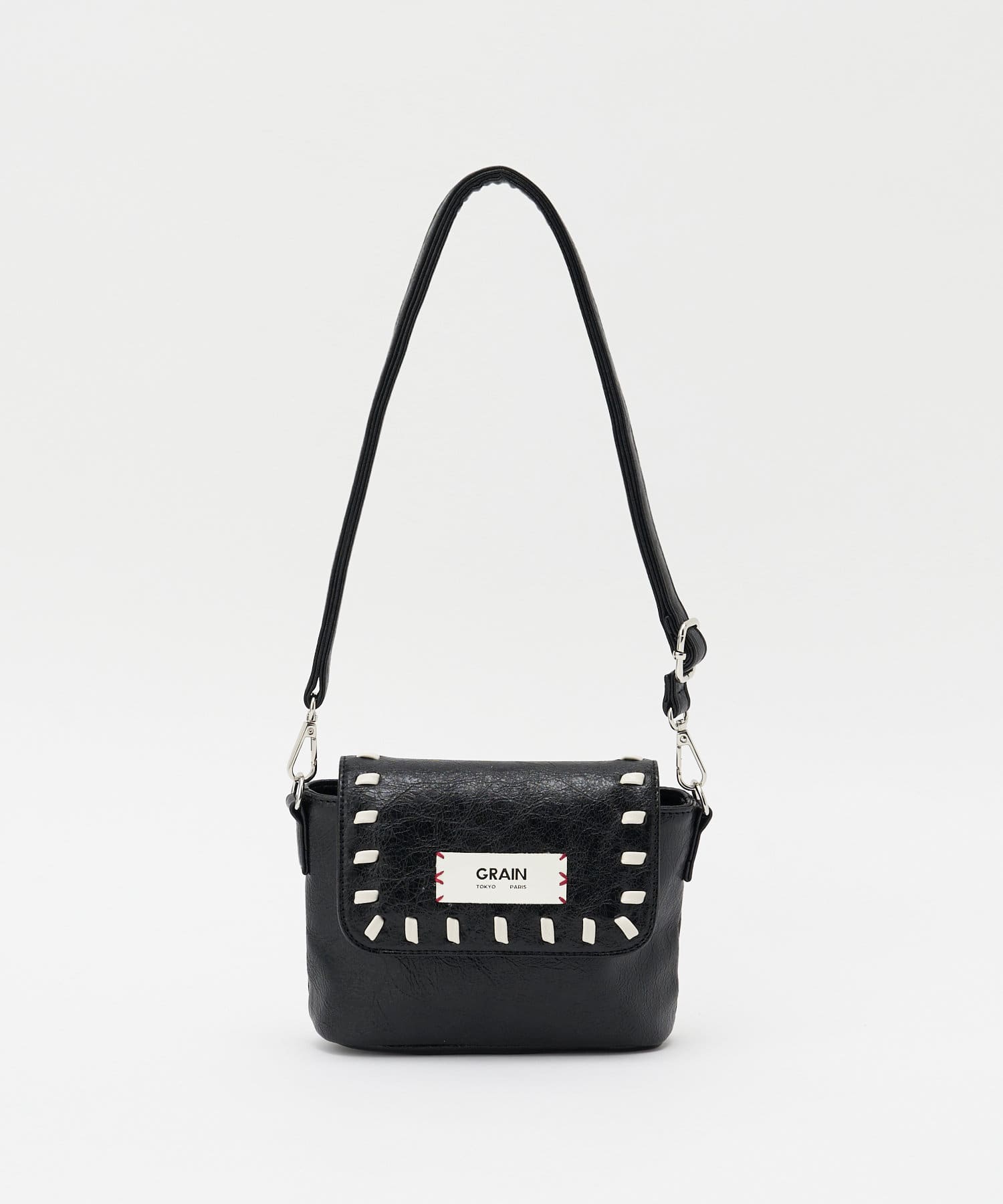 ツヤ感のあるレザー調素材やフラップ部分に施されたステッチが、さりげなく個性をプラスします。