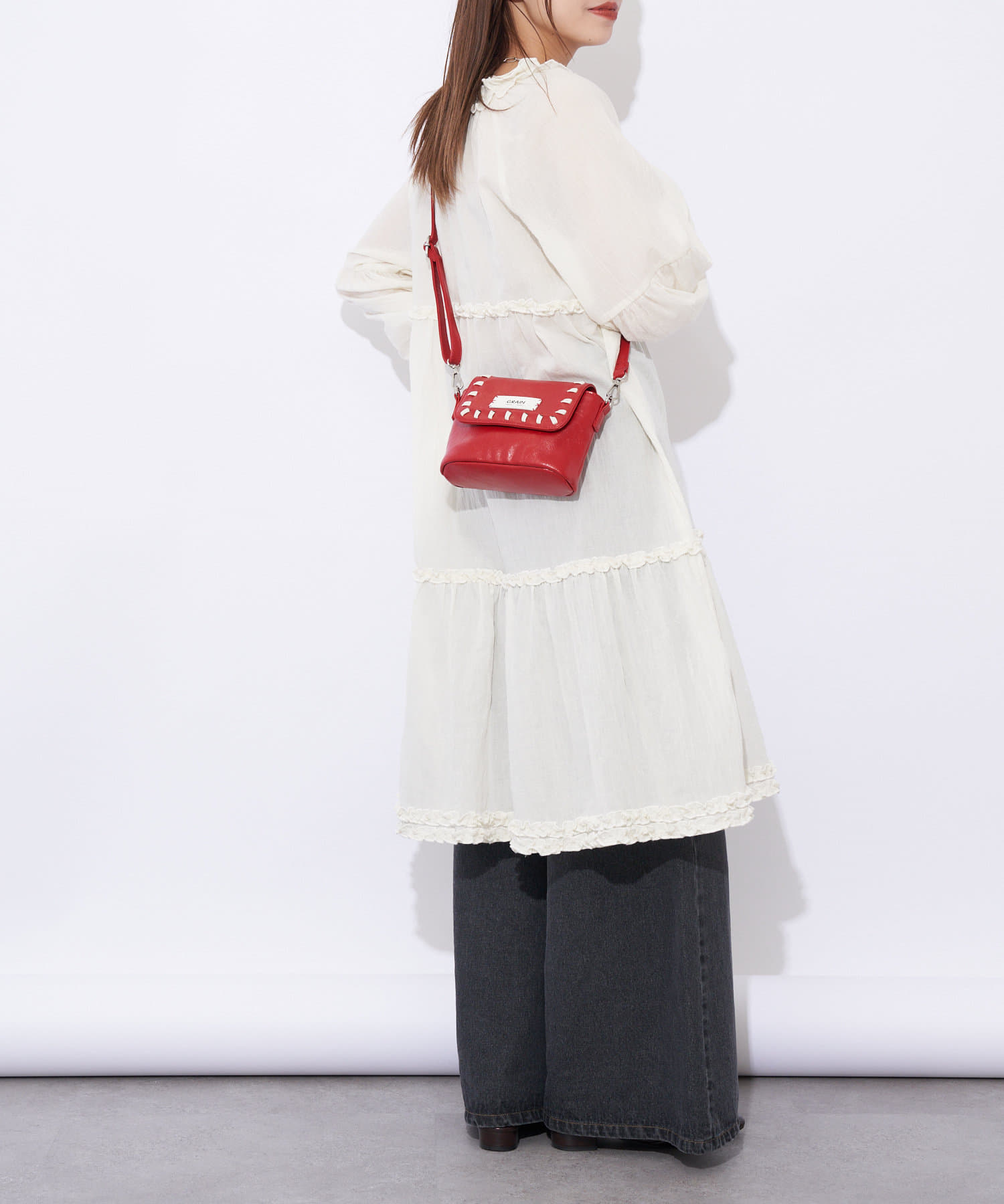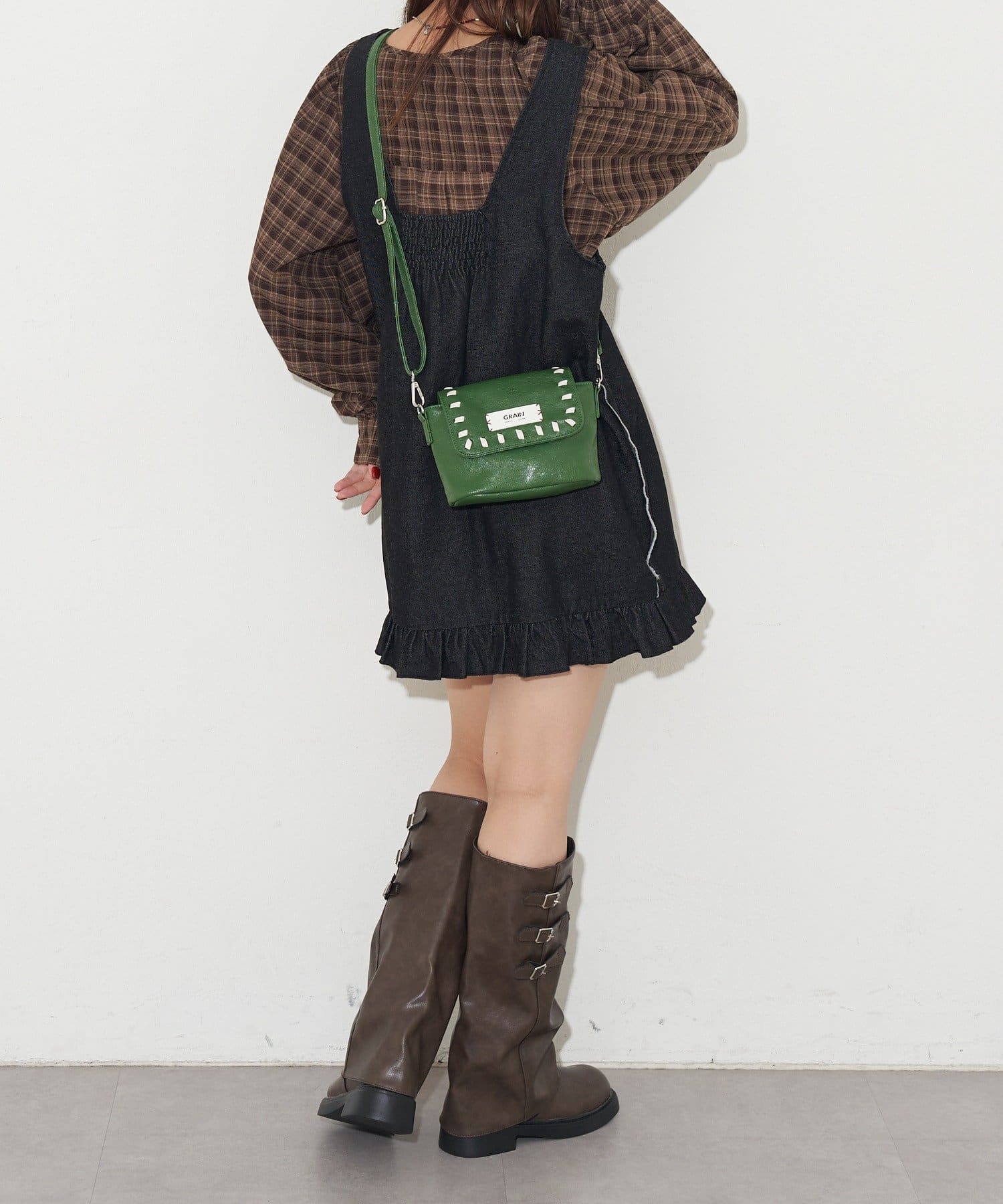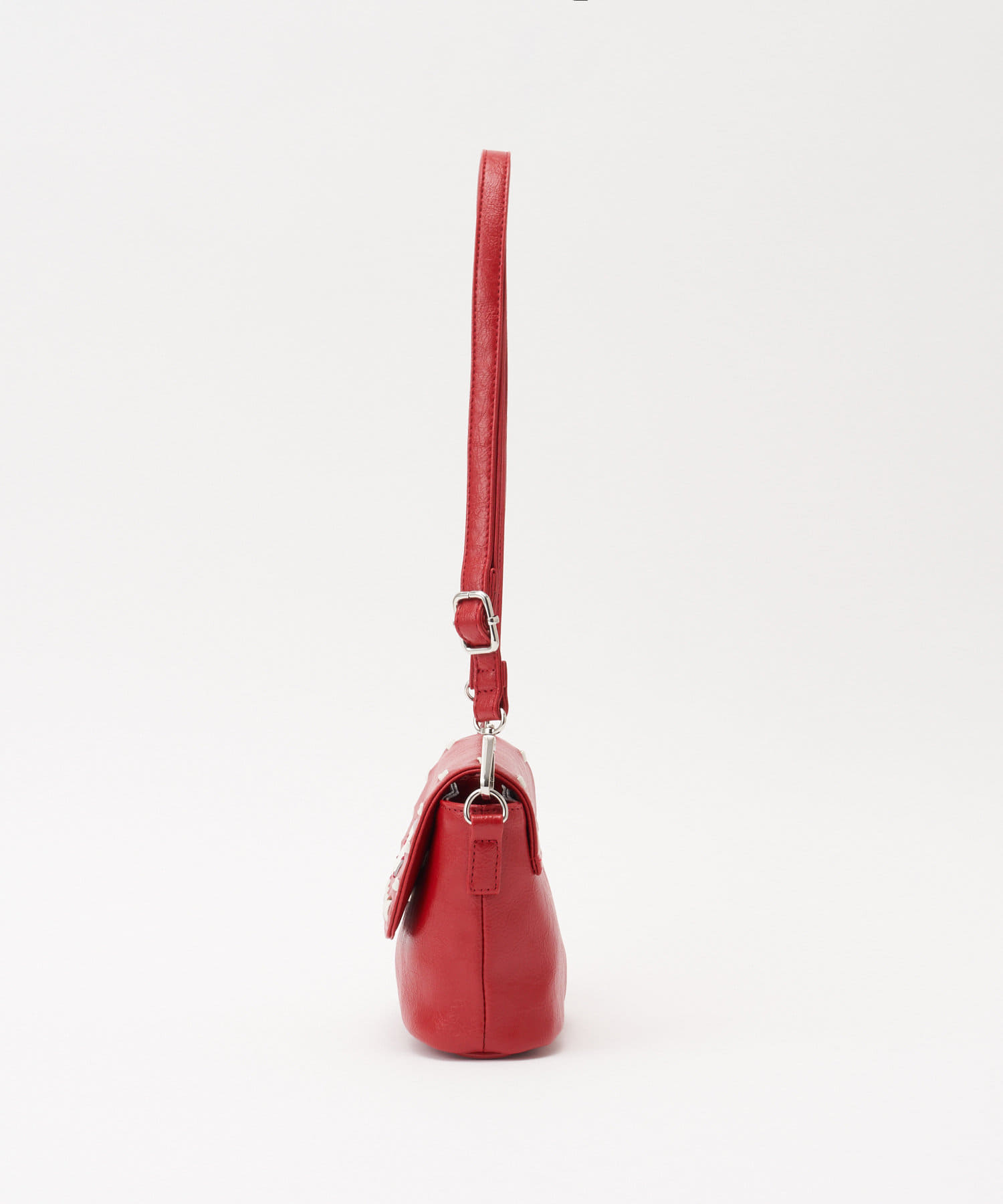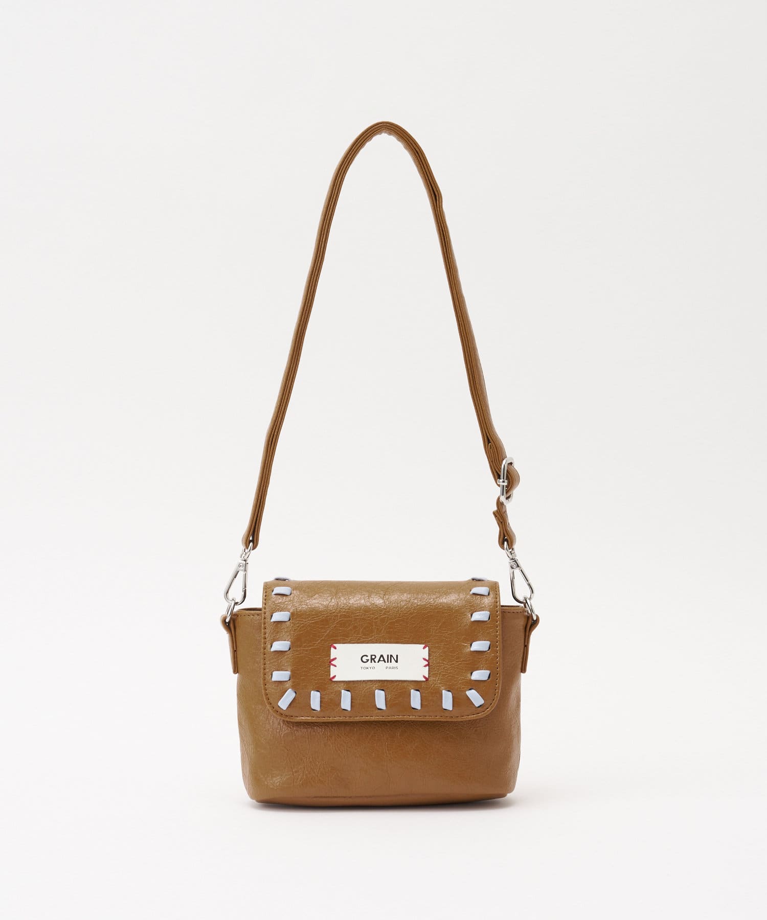 ツヤ感のあるレザー調素材やフラップ部分に施されたステッチが、さりげなく個性をプラスします。