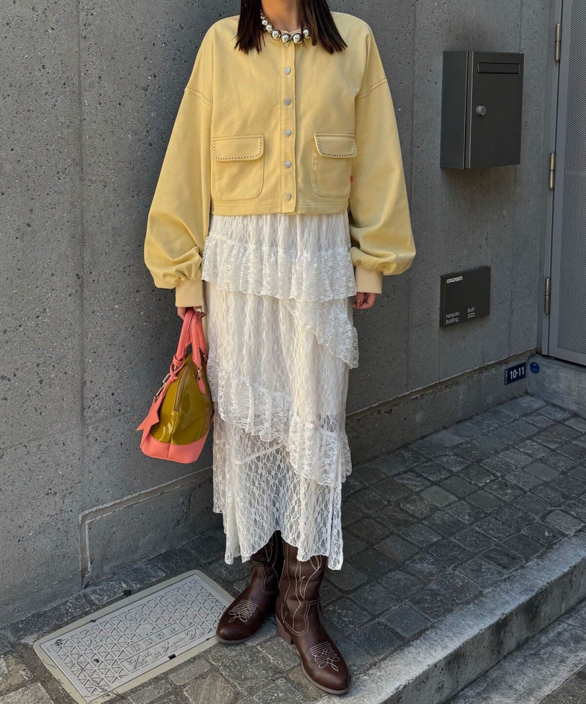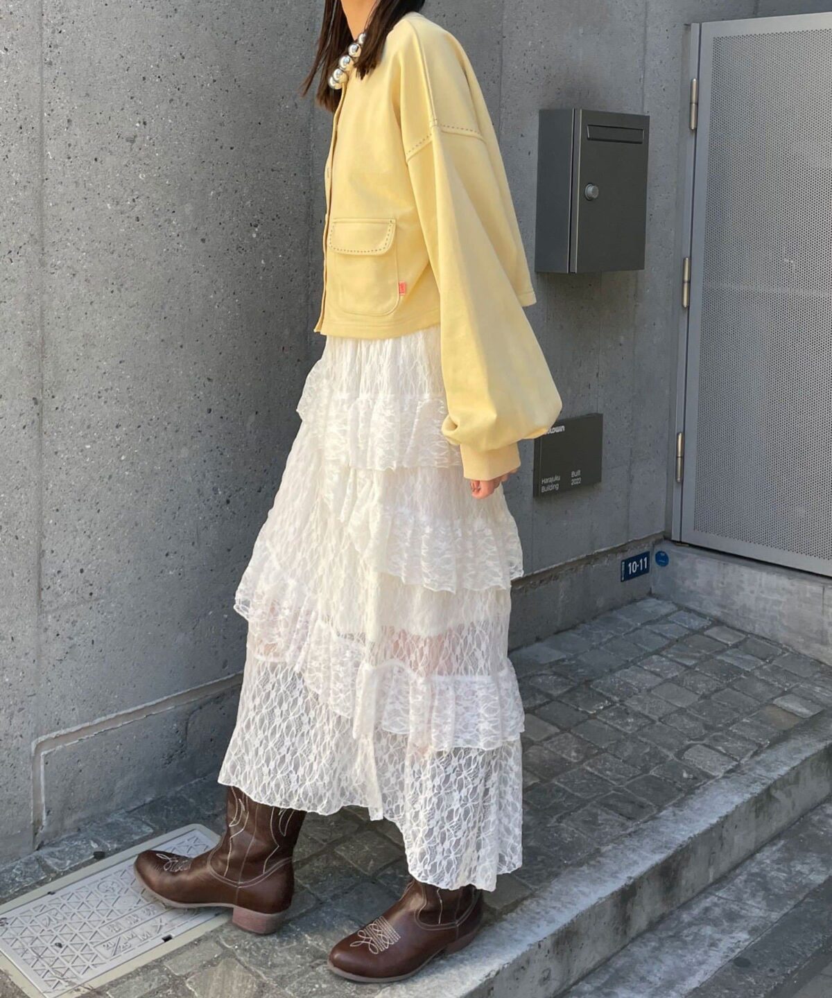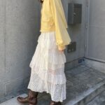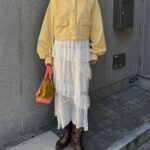 ティアードスカートやレースアイテムと合わせて、トレンド感のある甘辛ミックスコーデに。