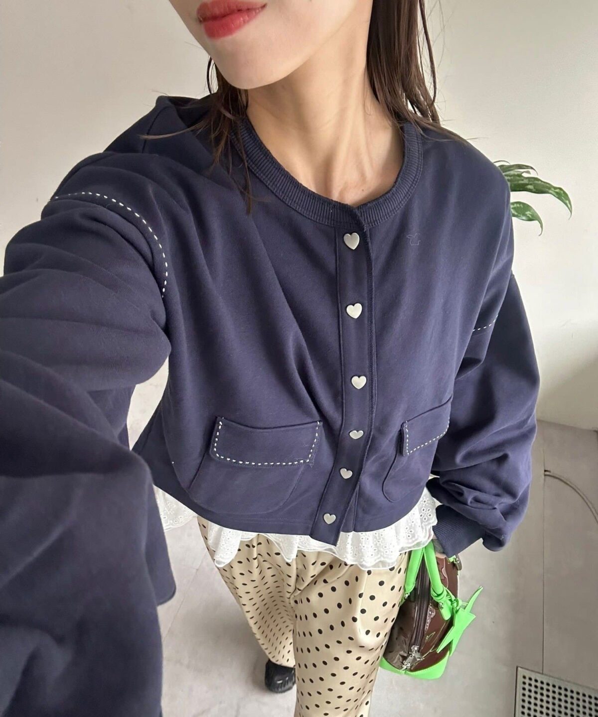 ハート型ボタンと配色ステッチがアクセントになった、スウェット素材のカーディガン。