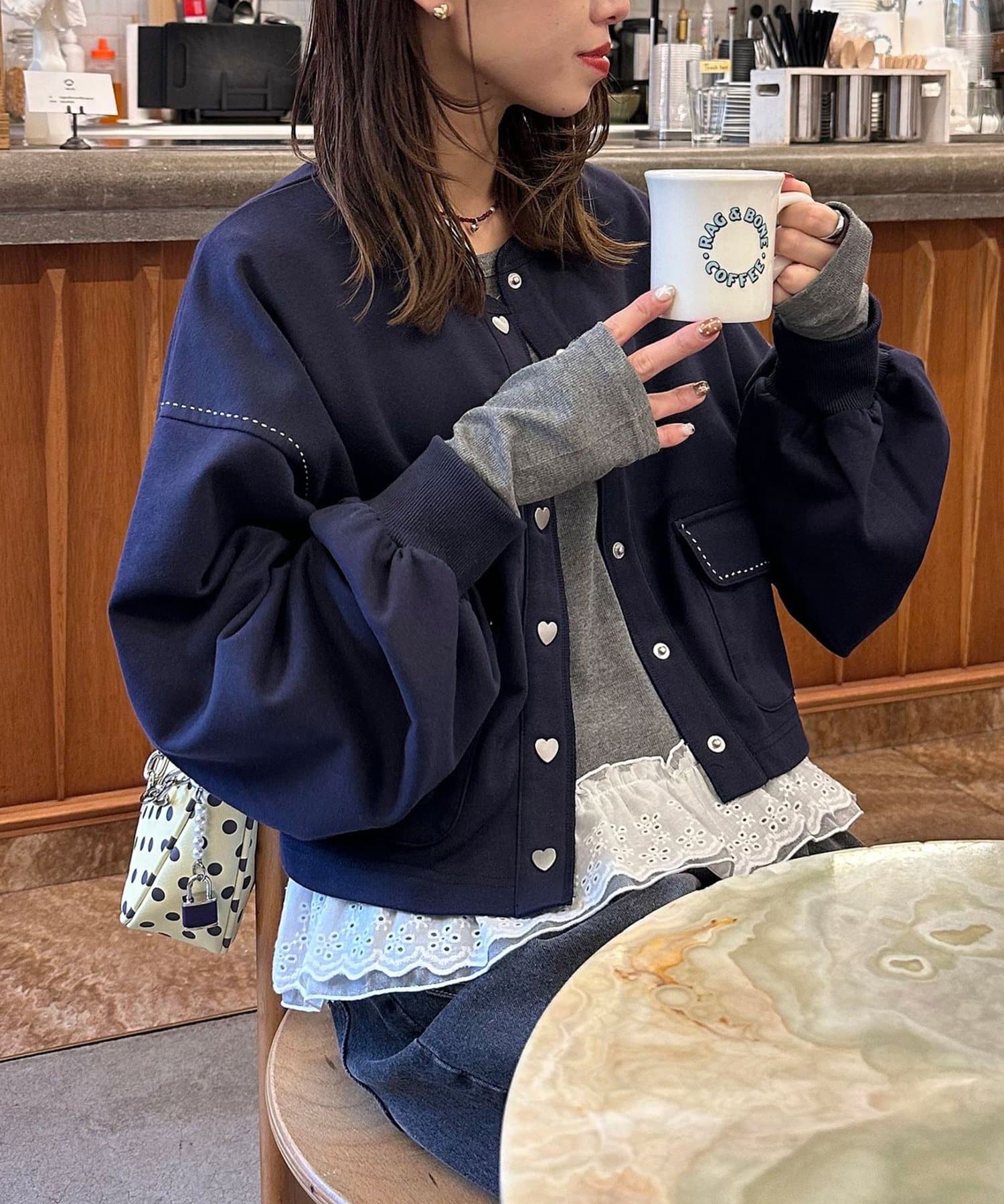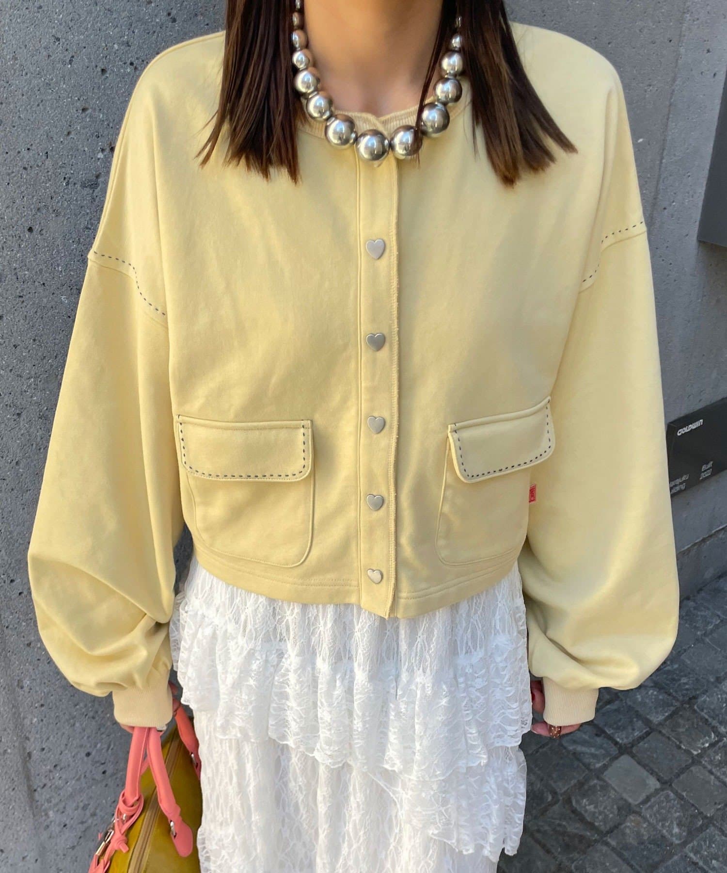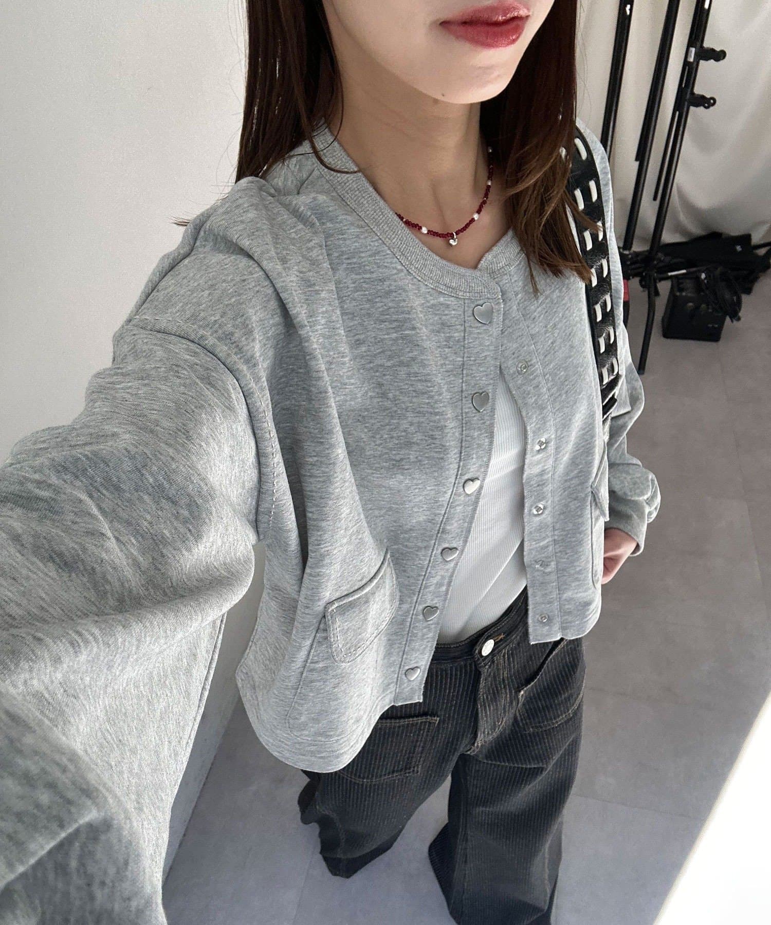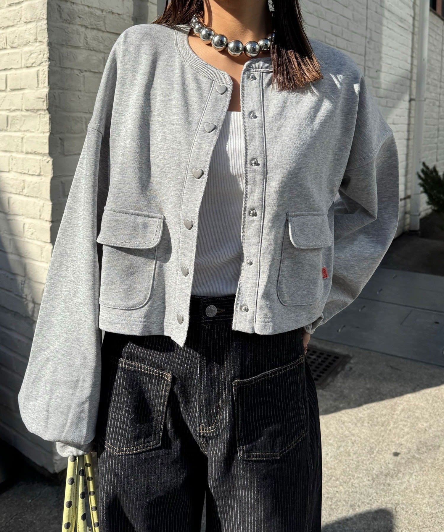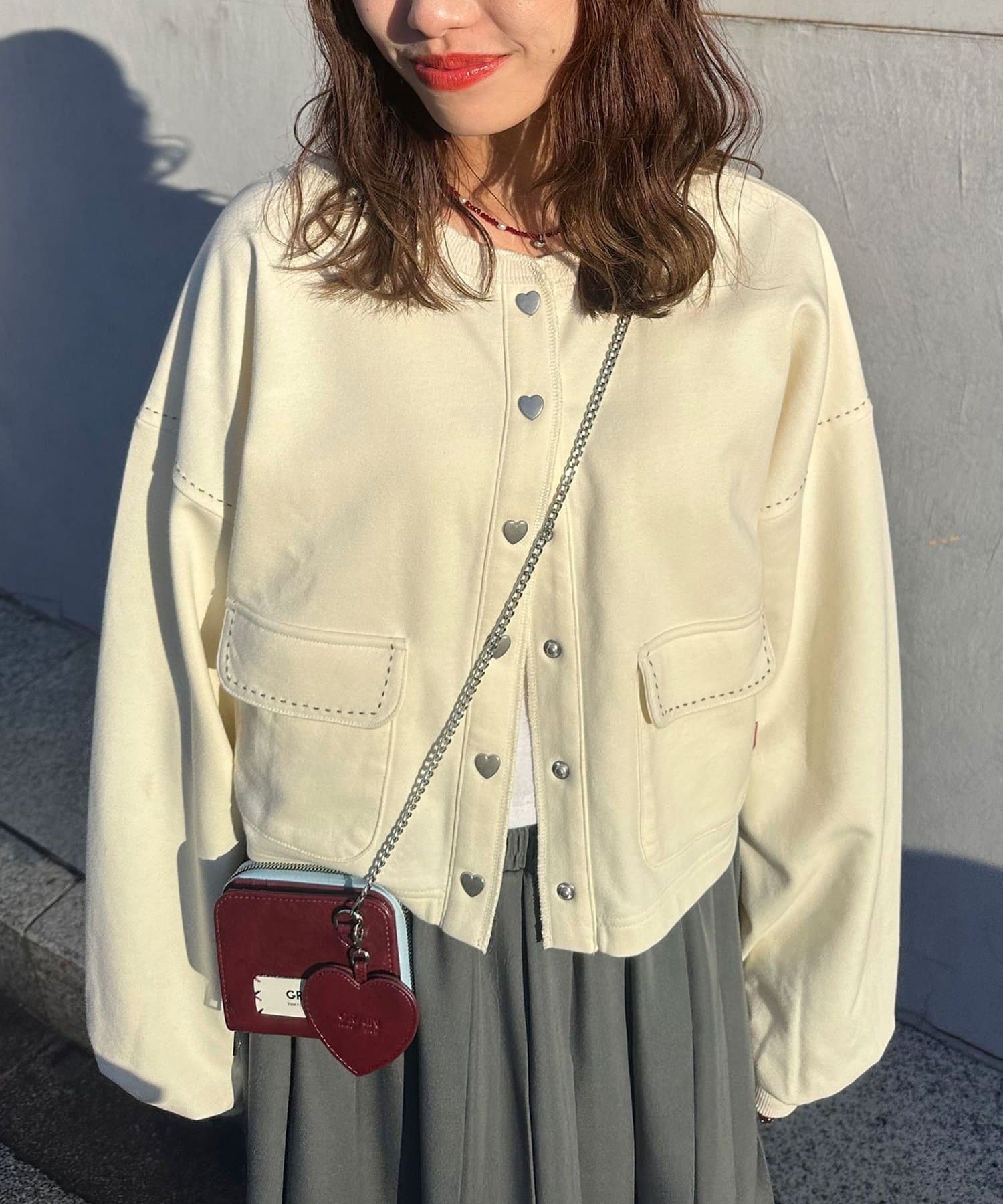 スウェットならではのラフさに、ハートボタンのさりげない甘さをプラスし、デイリーに取り入れやすいデザインに仕上げました。