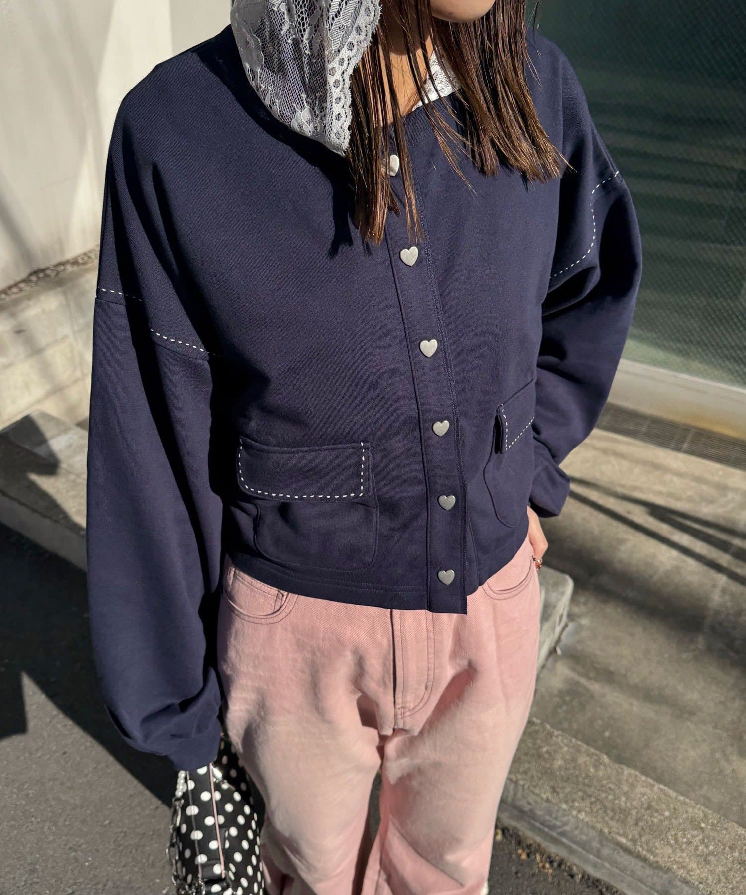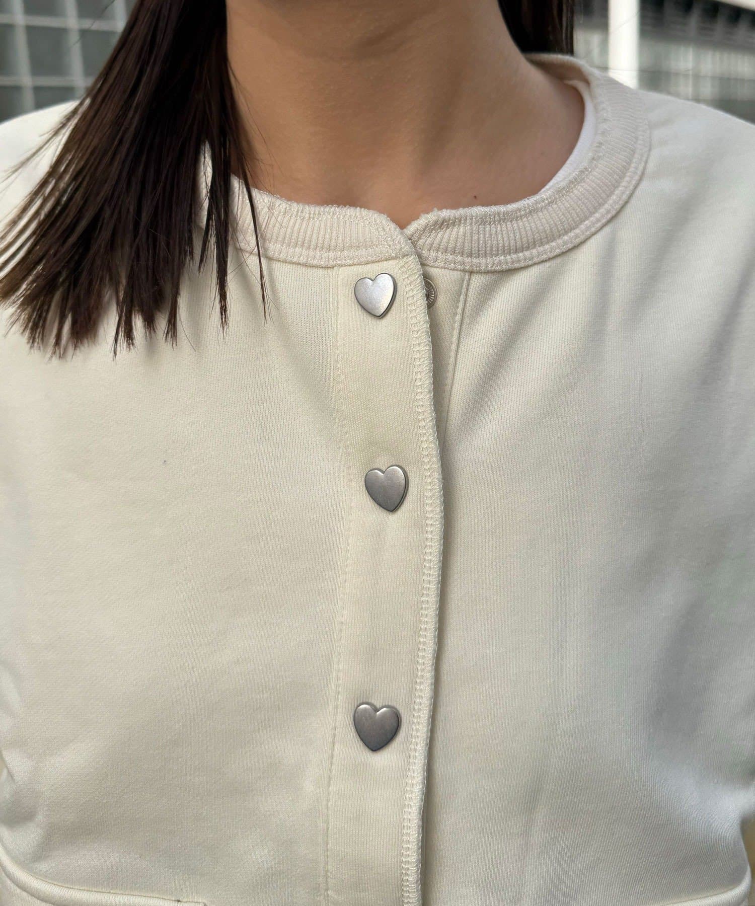 ハート型ボタンと配色ステッチがアクセントになった、スウェット素材のカーディガン。