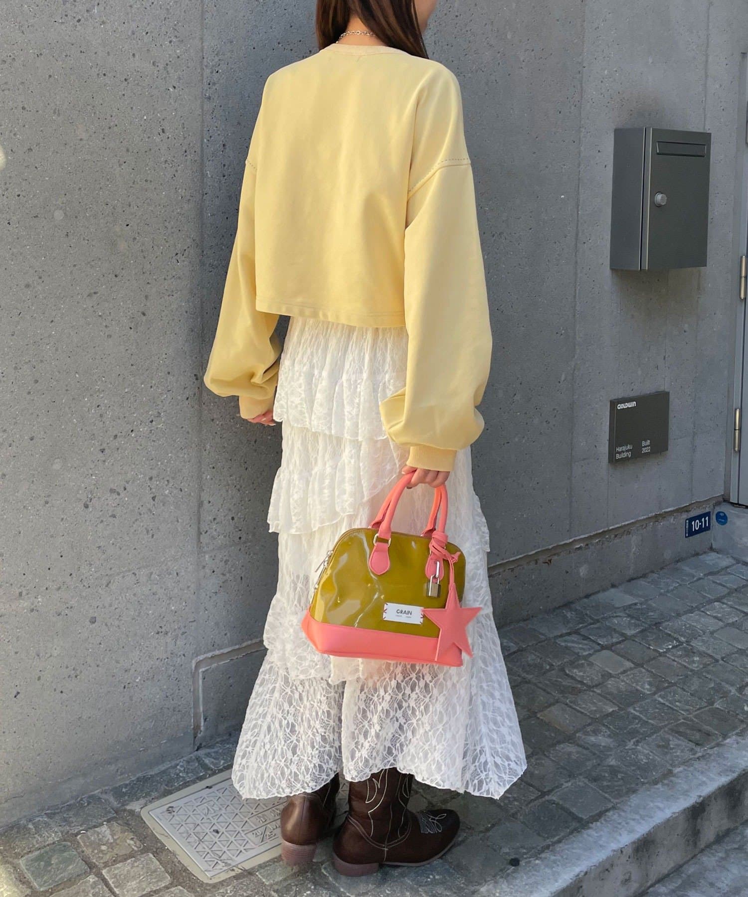 ティアードスカートやレースアイテムと合わせて、トレンド感のある甘辛ミックスコーデに。