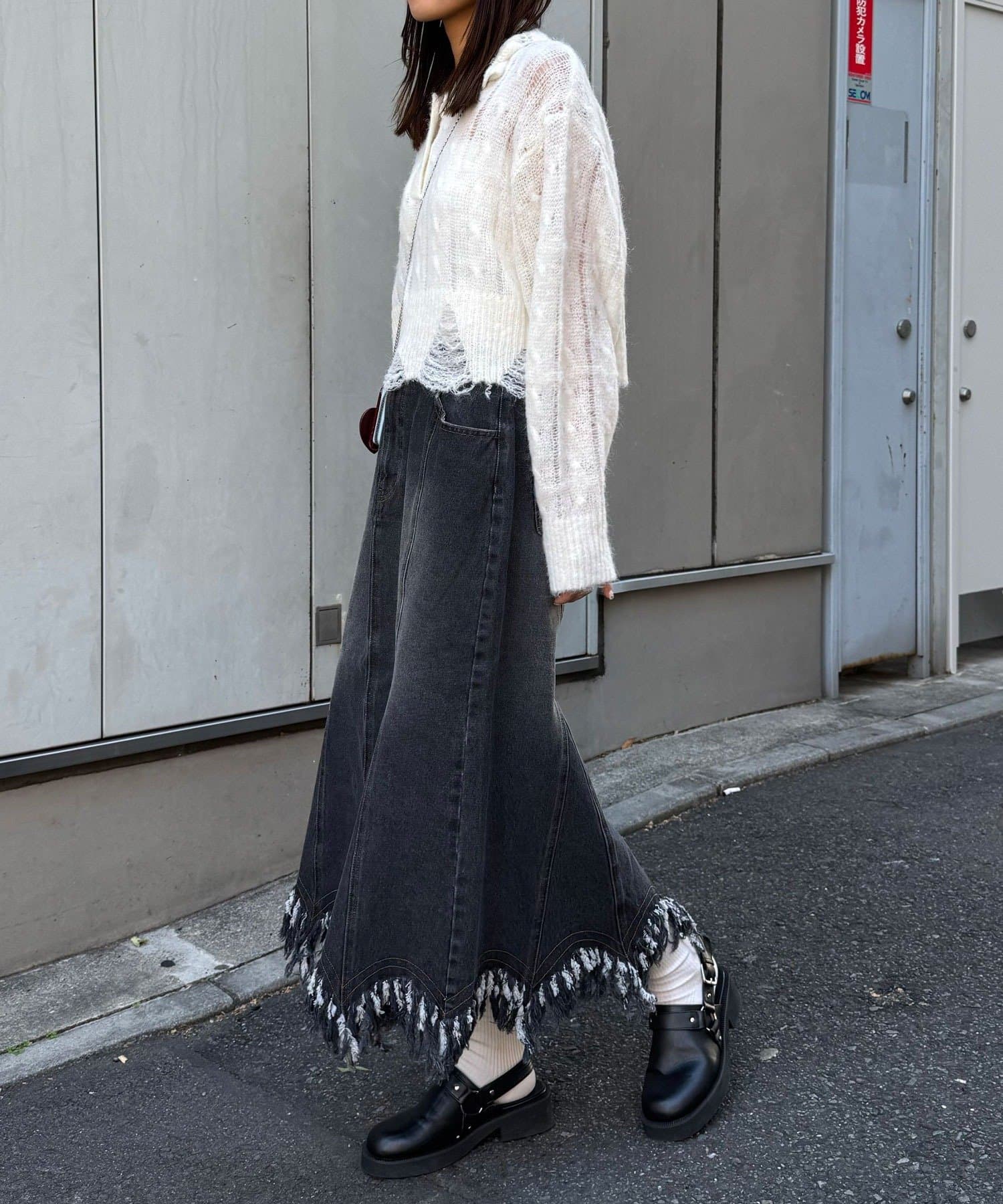 足元は厚底シューズでボリュームを出すと、裾のフリンジがより可愛く引き立ちます。