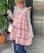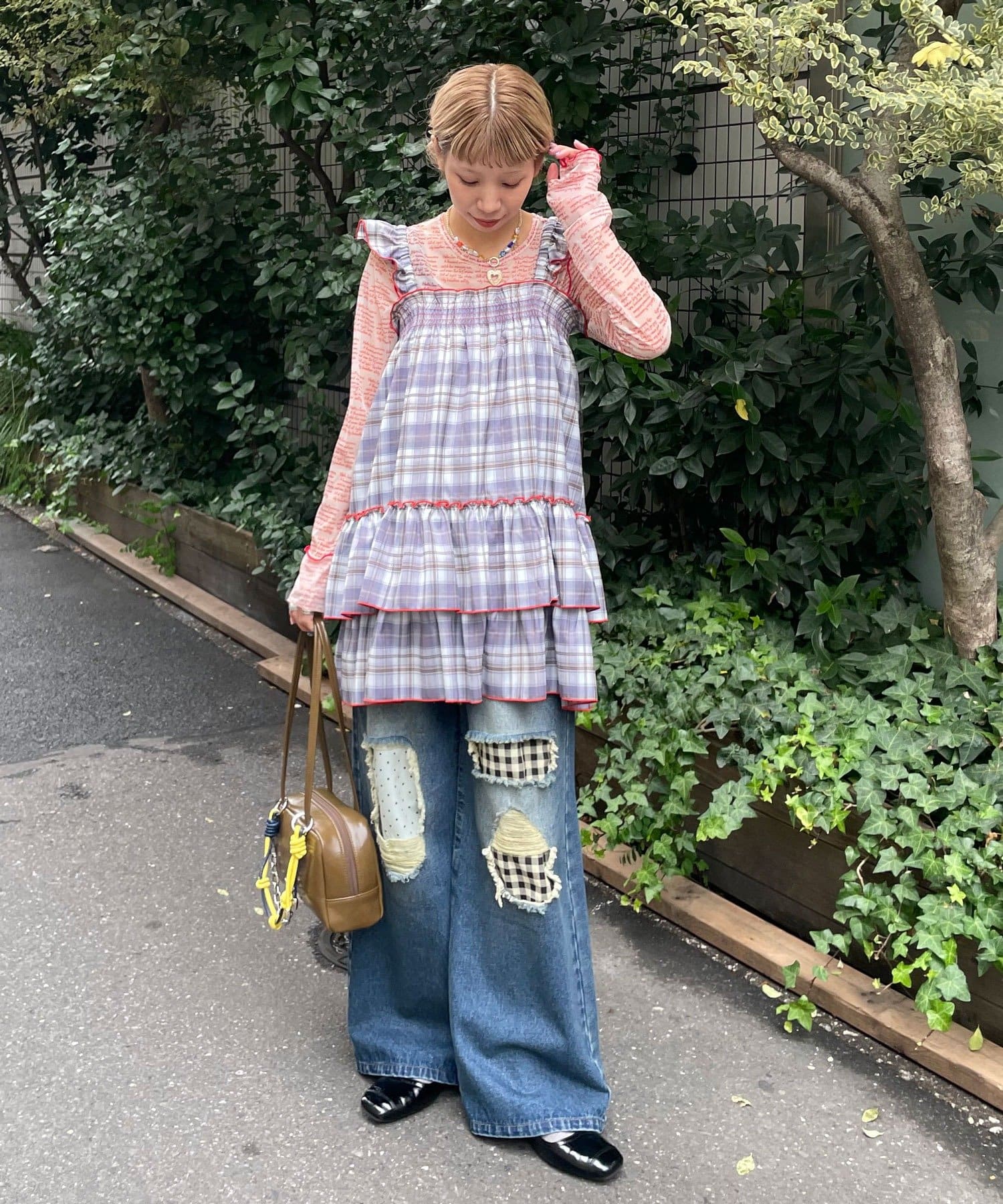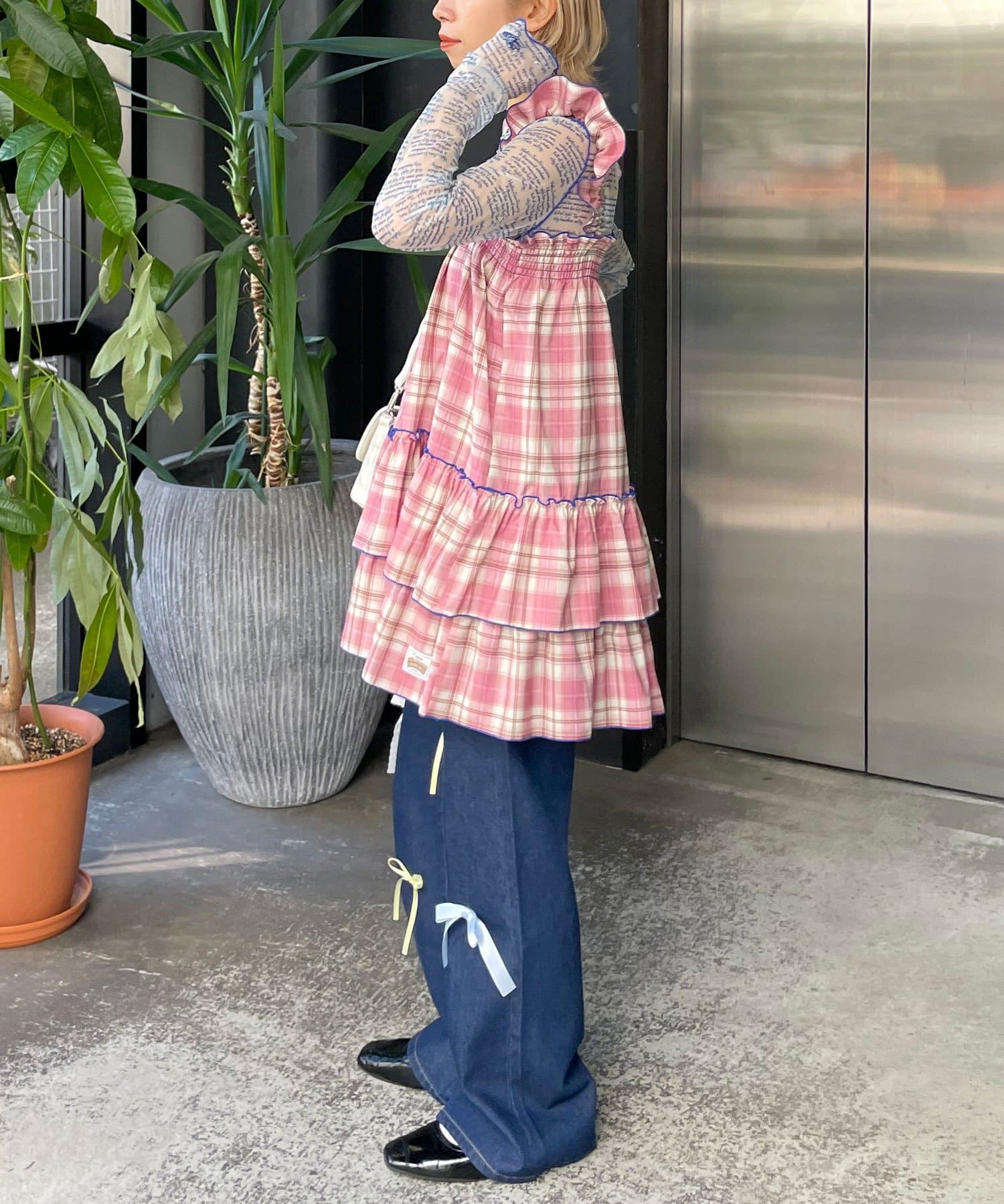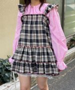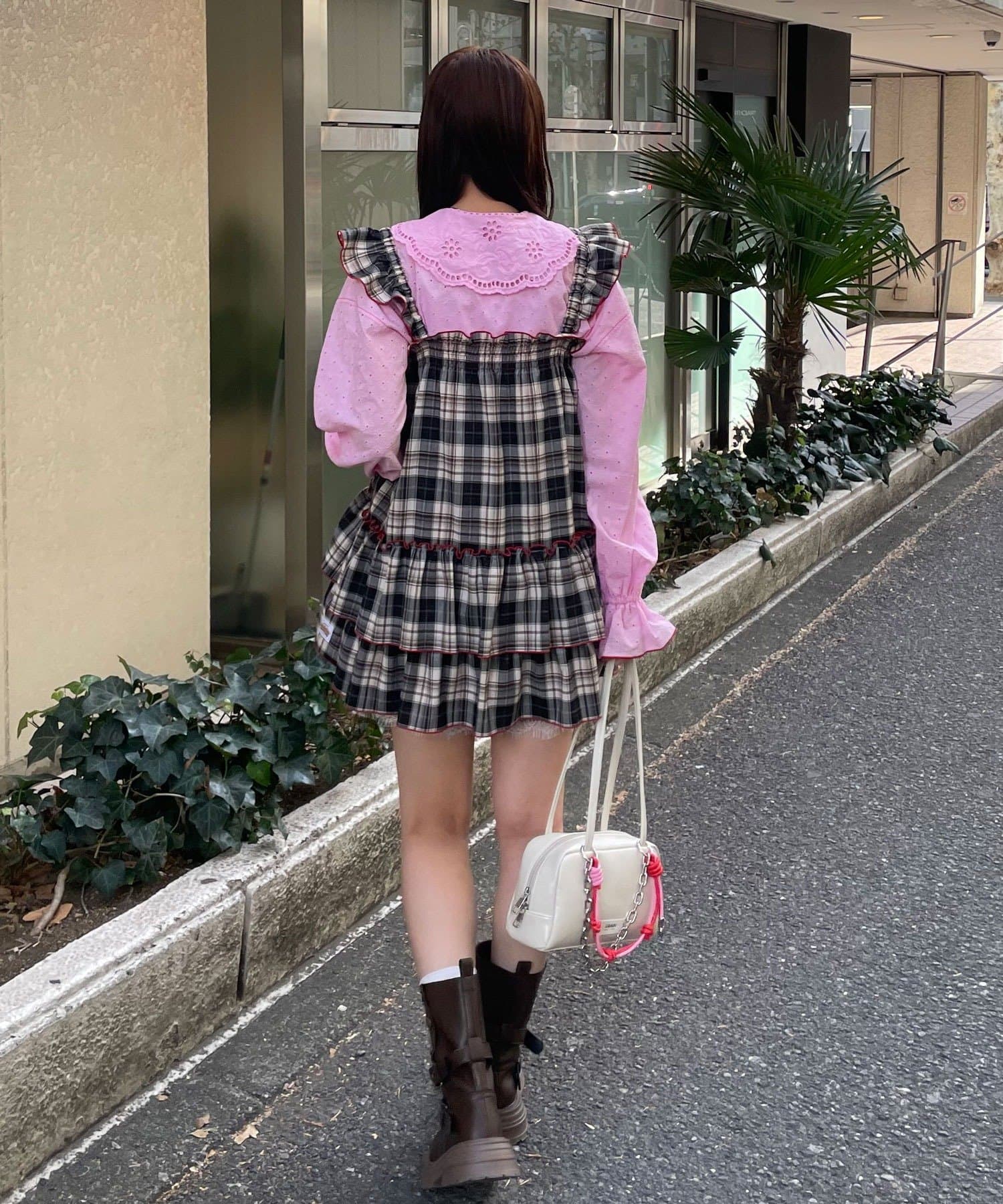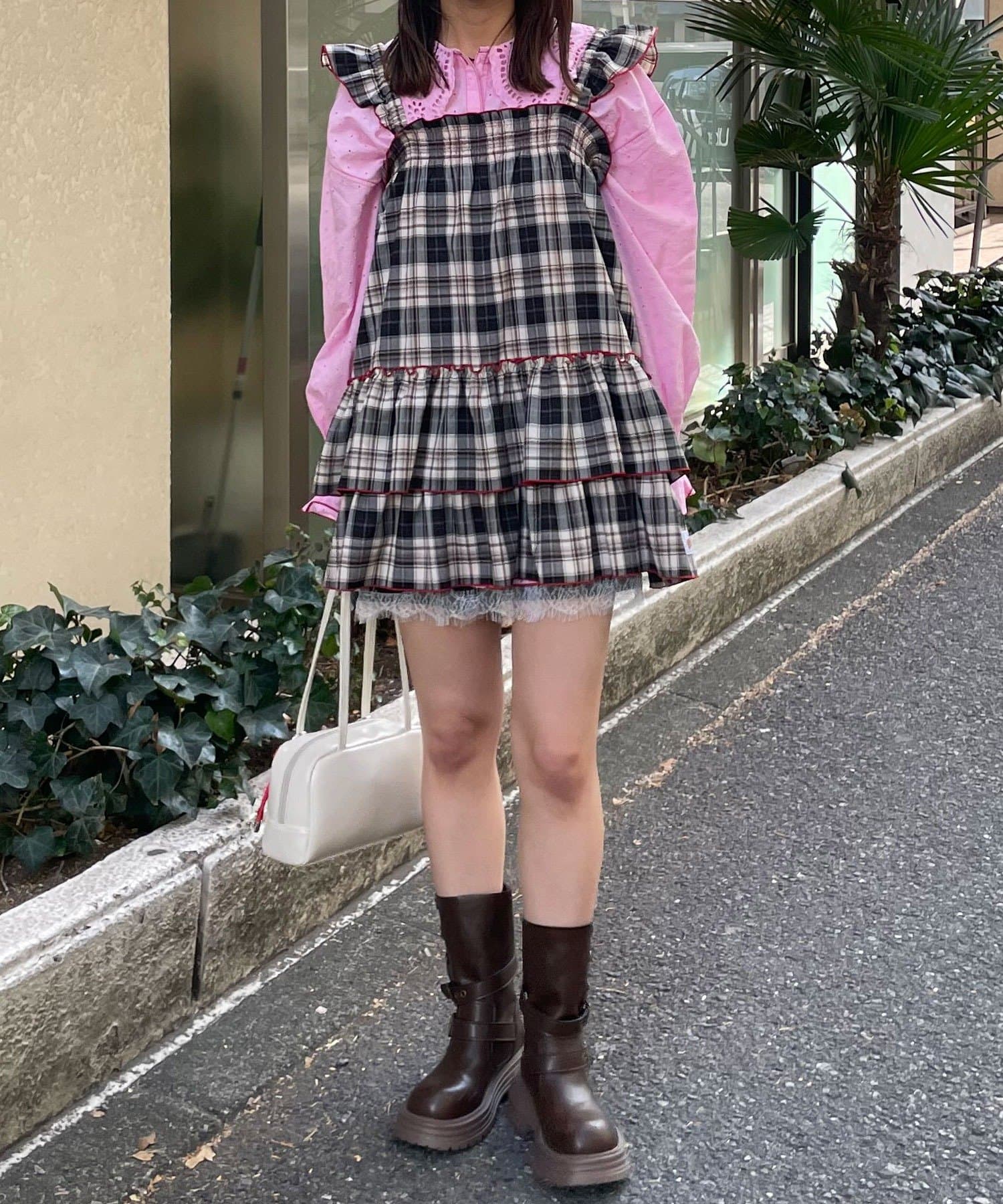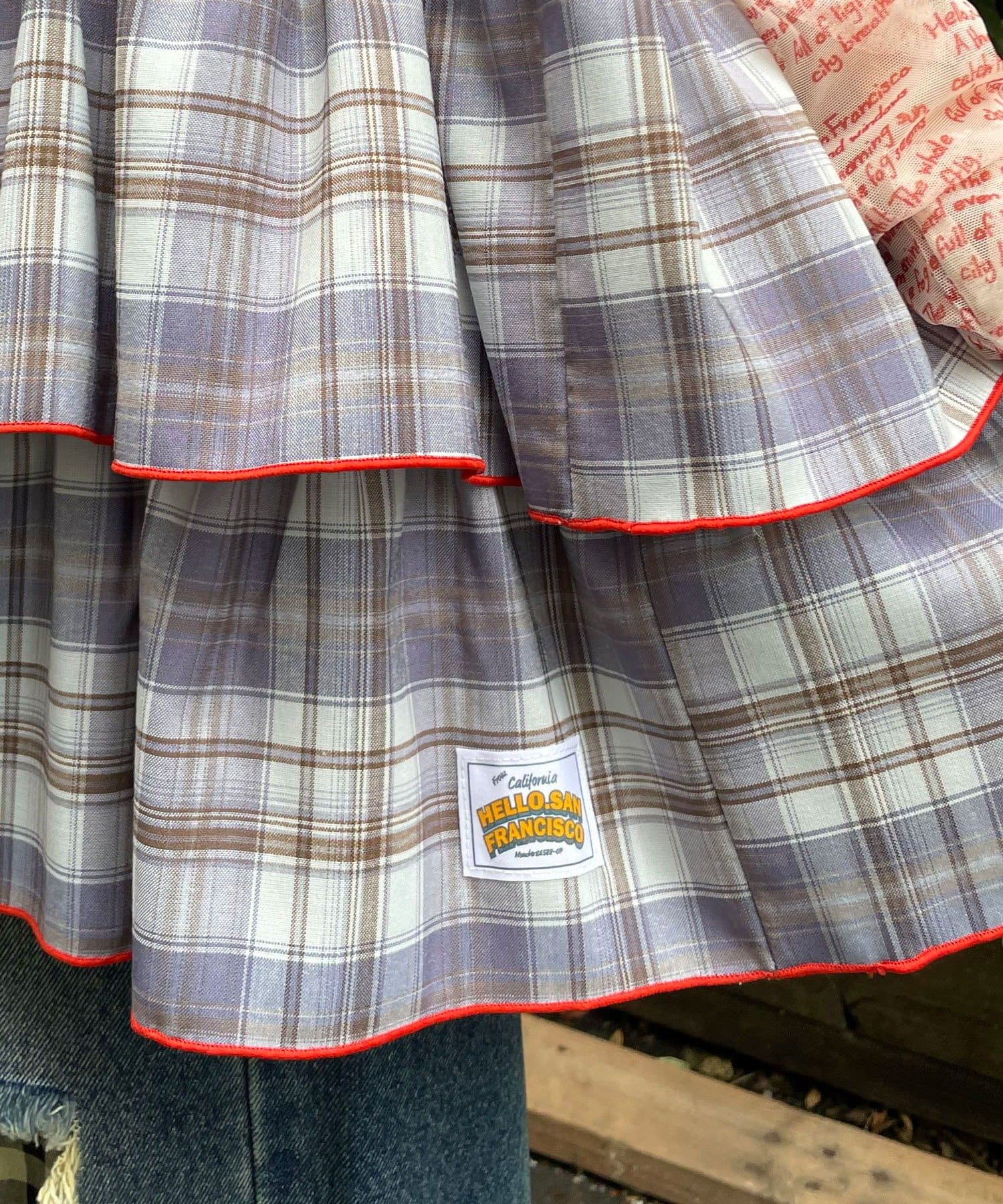 • 豐富視覺層次:以經典格紋為基底,加入荷葉邊拼接(Frill 切替)以及吸睛的對比色捲邊(Mellow Stitch)點綴,設計感十足。