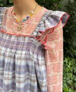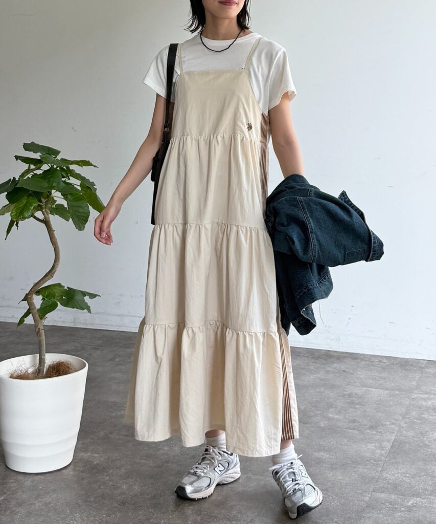 胸元のシャーリングとティアードシルエットで、ゆったりしつつも立体感のある仕上がりに。