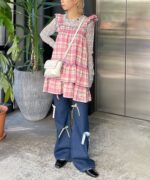 チェック柄をベースに、フリル切替と配色メローを効かせたチュニックワンピース。