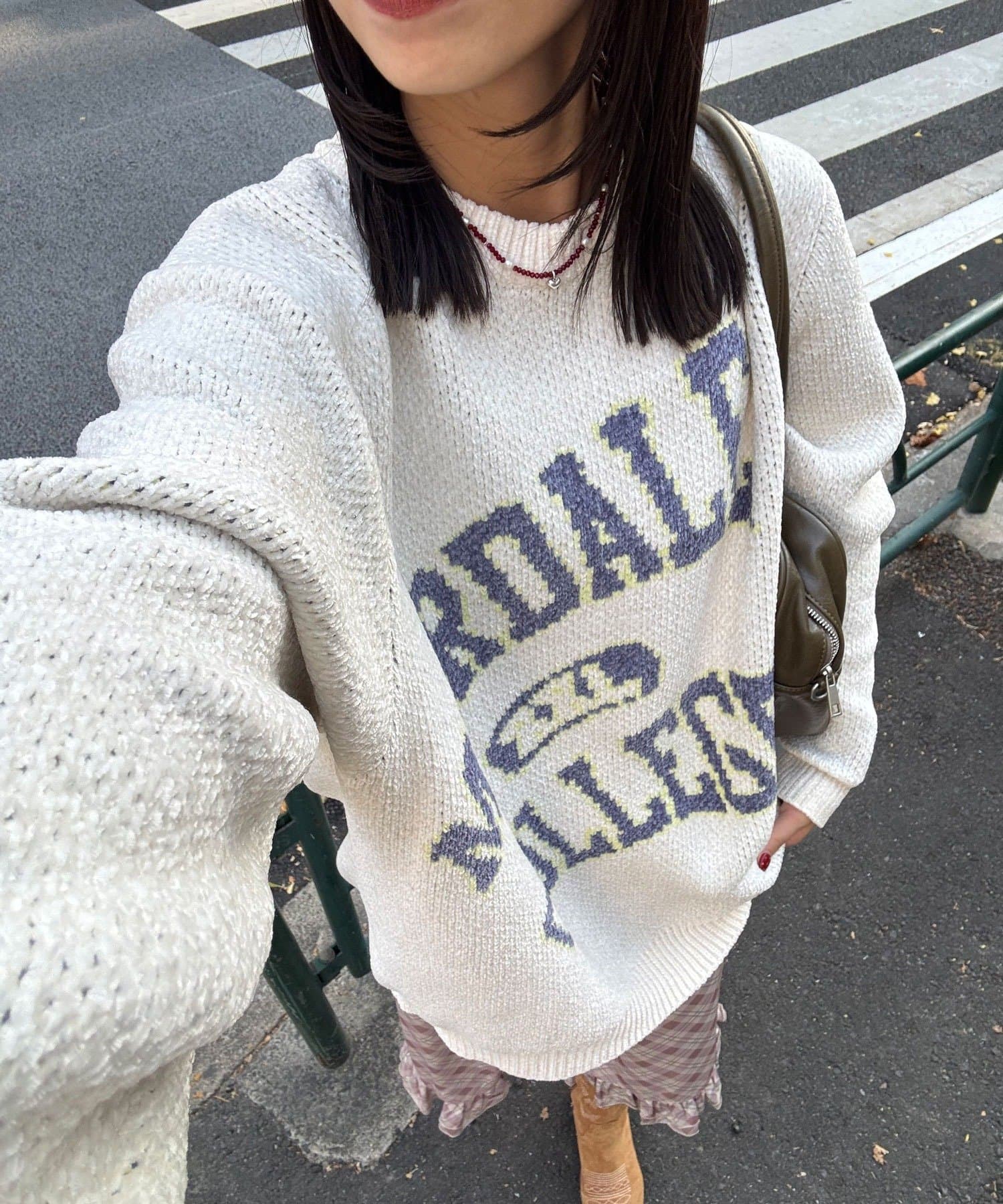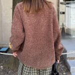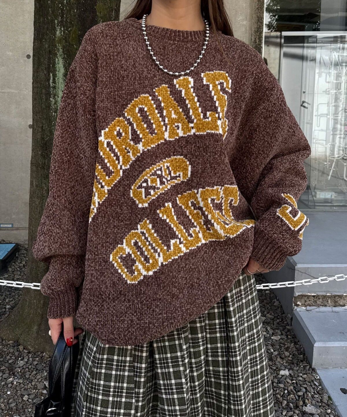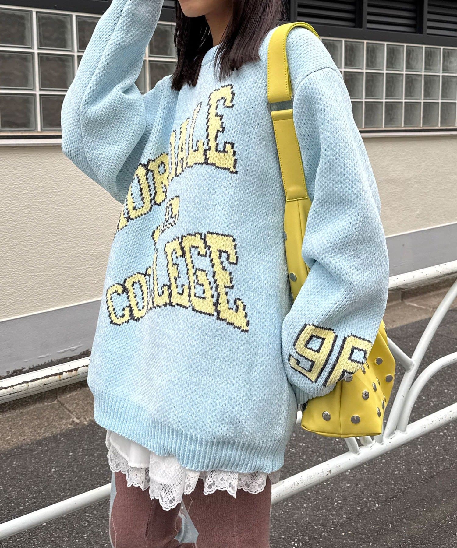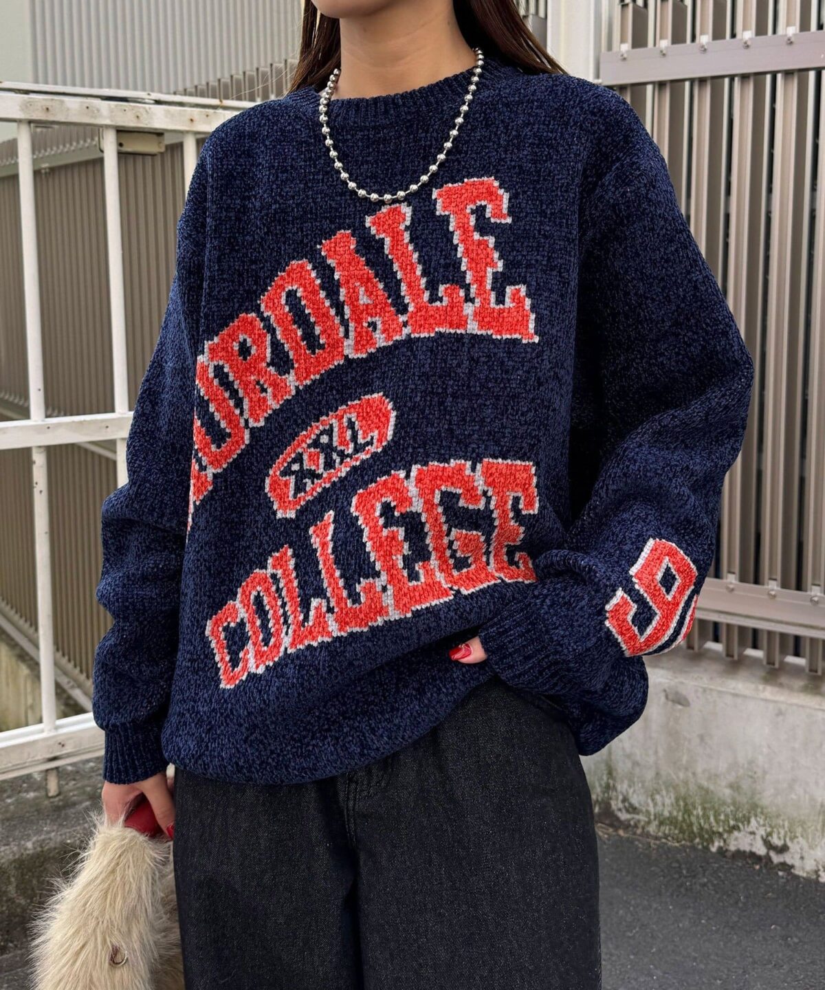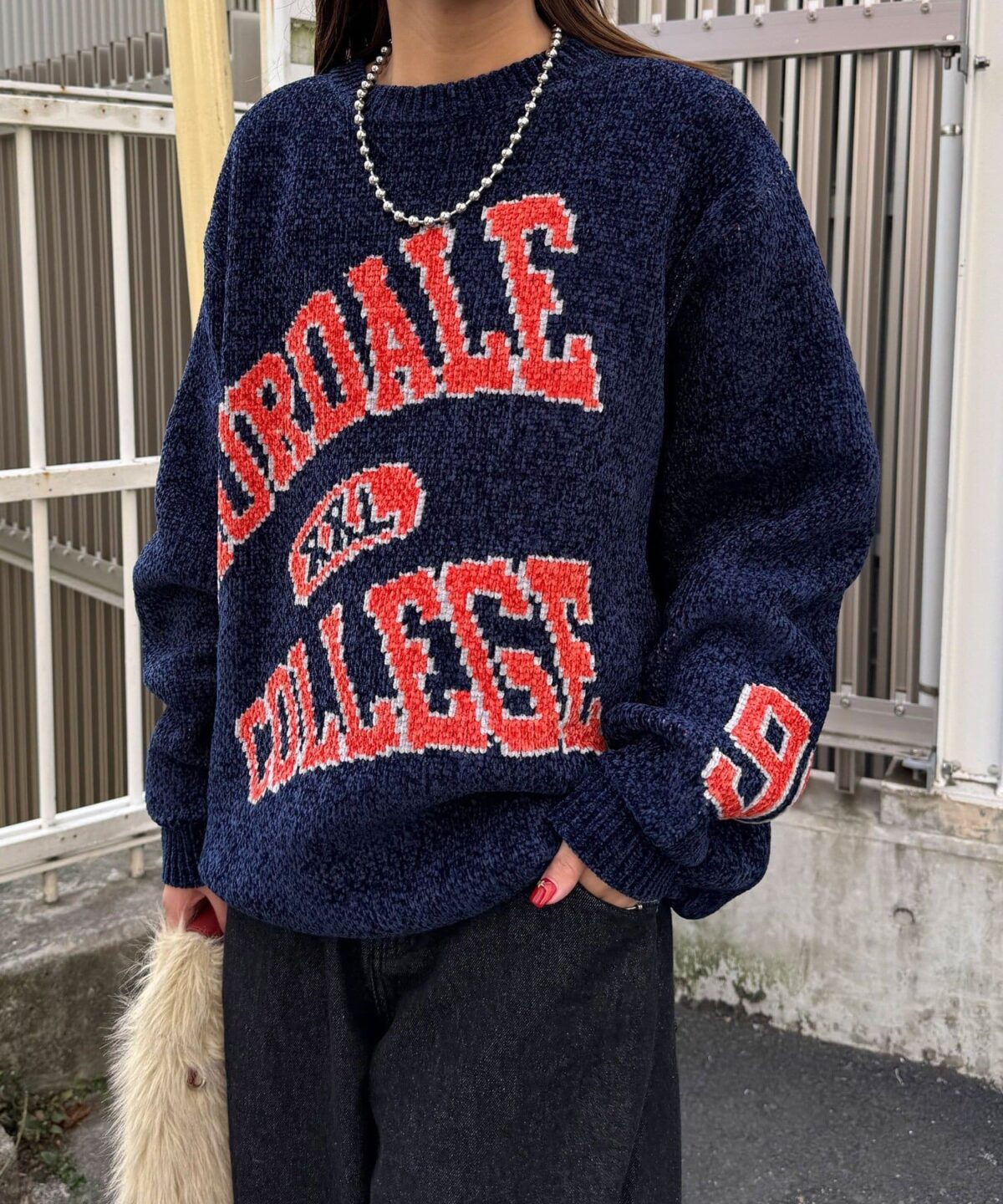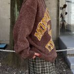 中性大學針織衫,以蓬鬆編織紗製成。