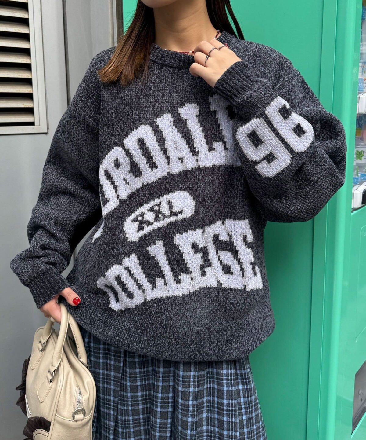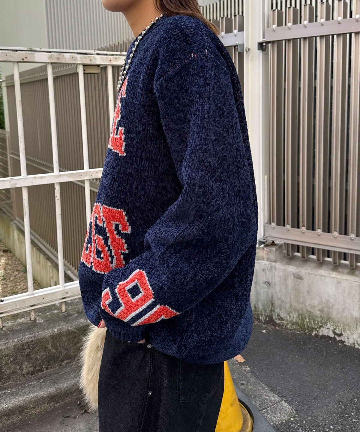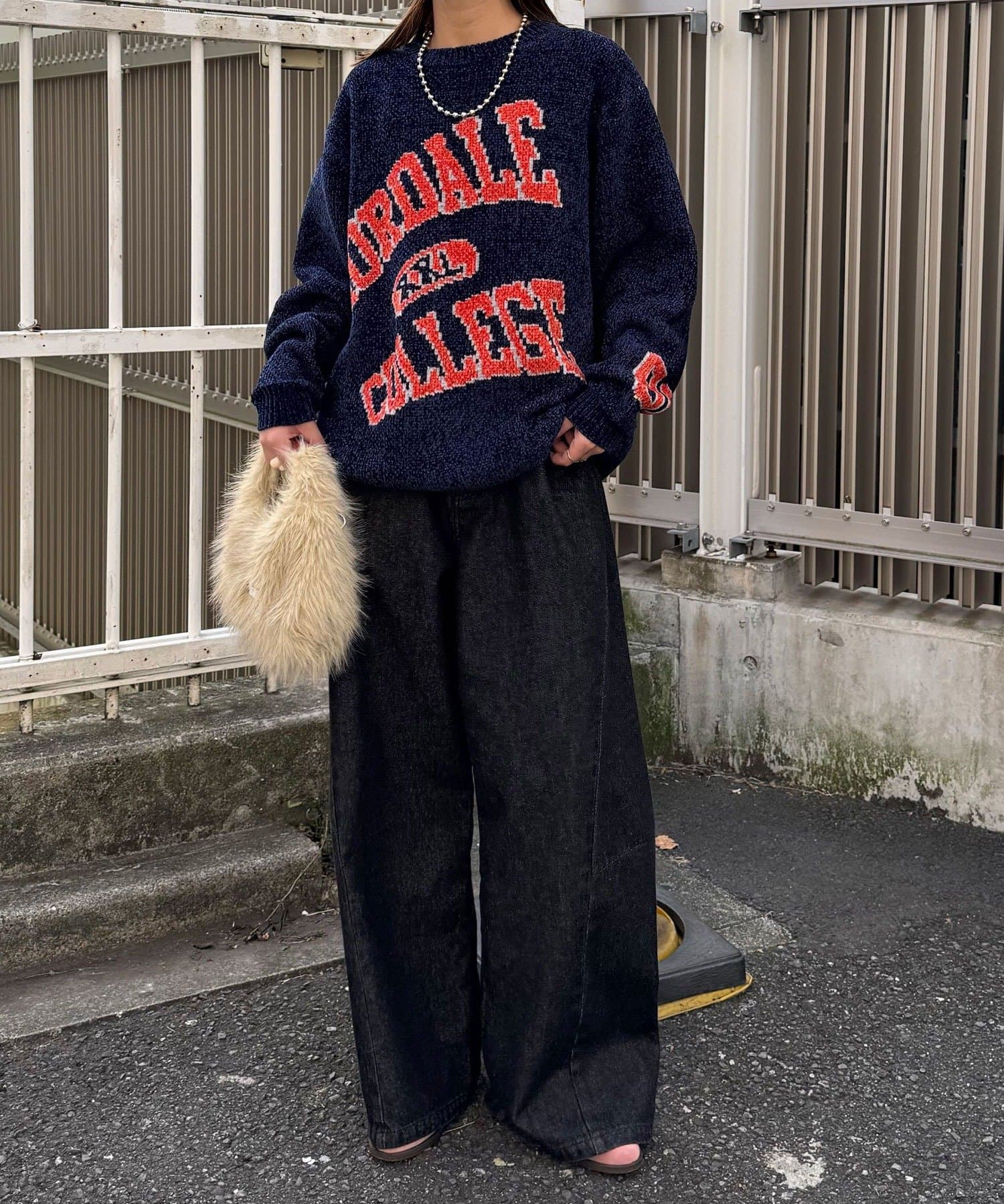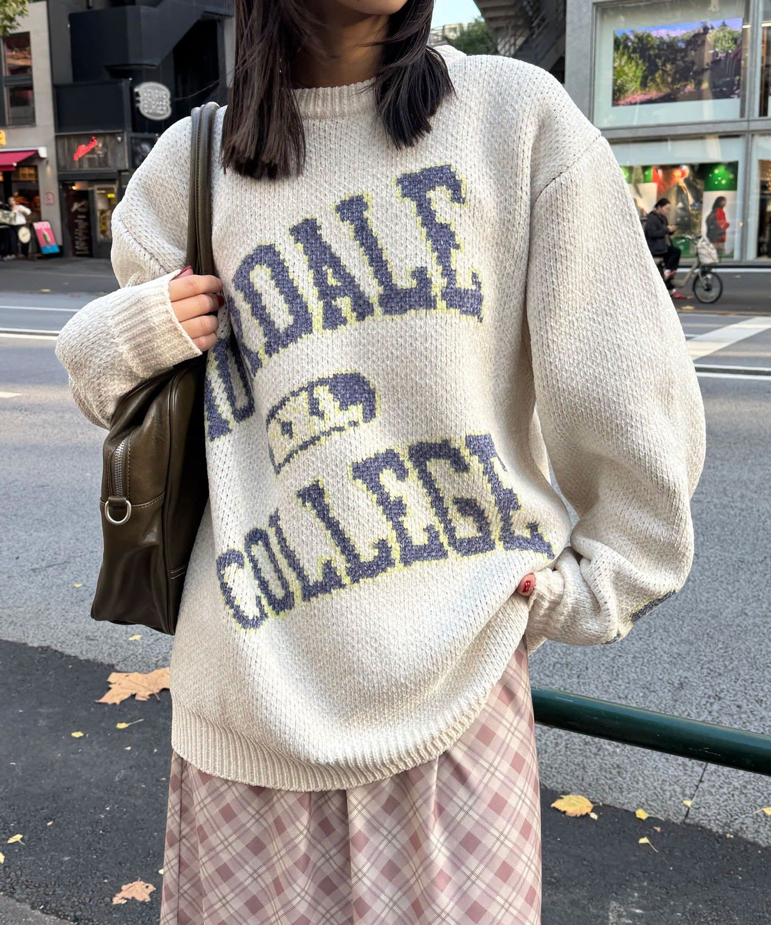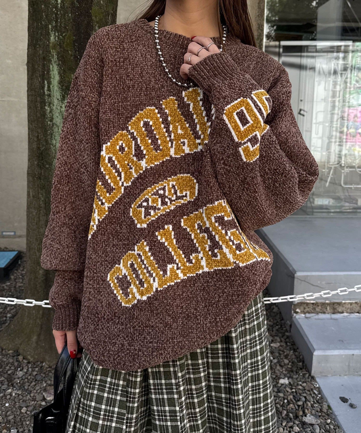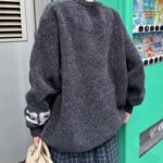 中性大學針織衫,以蓬鬆編織紗製成。