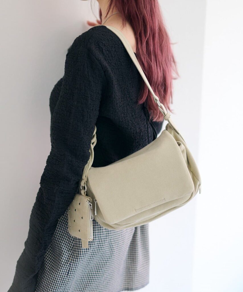 ショルダーベルトは長さ調節可能。肩掛けや斜め掛けなど、シーンやスタイルに合わせて使い分けられます。