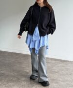 ・カーディガン+フレアパンツにスカートを合わせて、コーデのアクセントに
