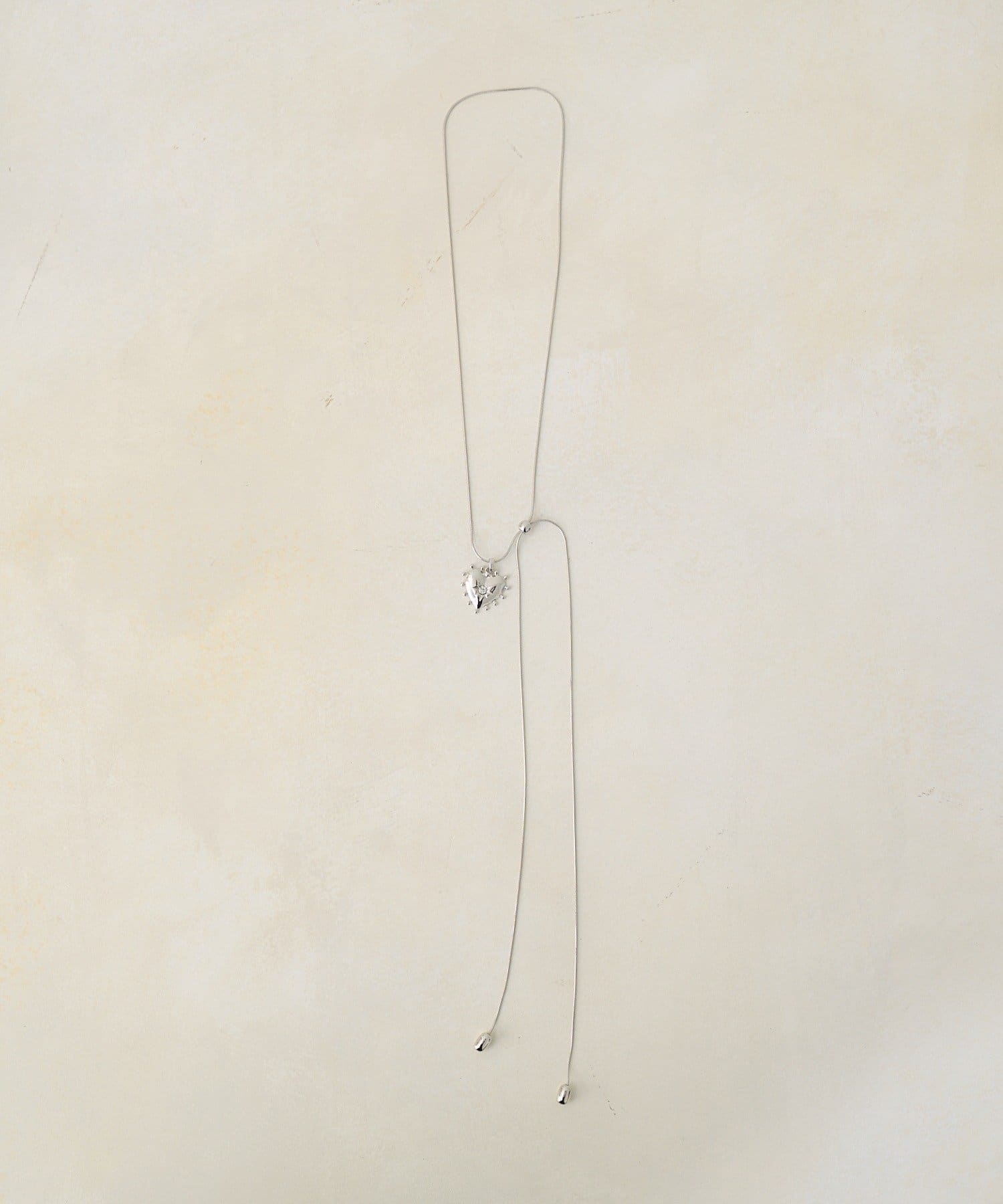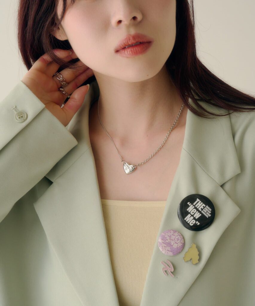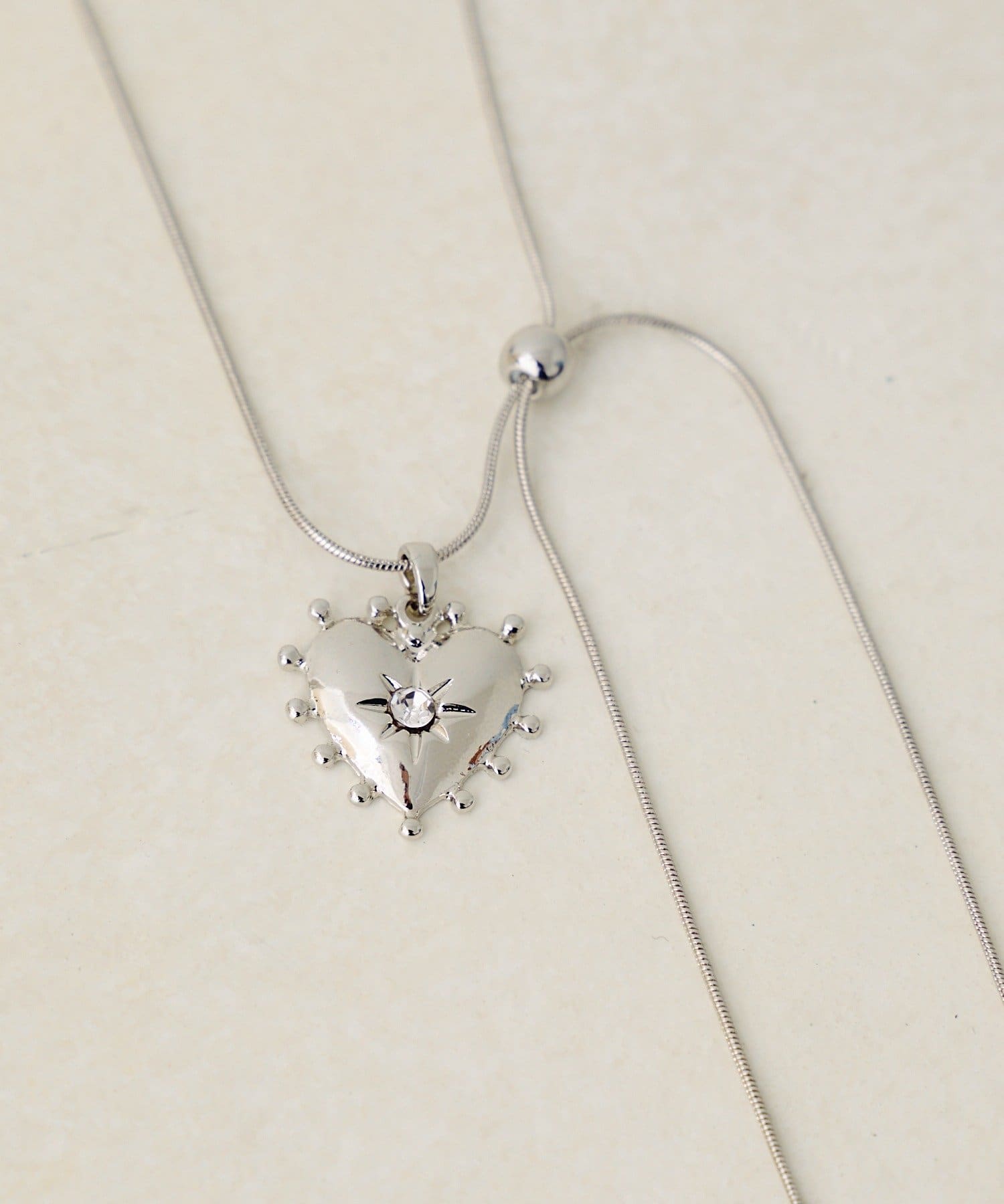 艶感のあるメタルハートと、なめらかに沿うスネークチェーンの組み合わせで