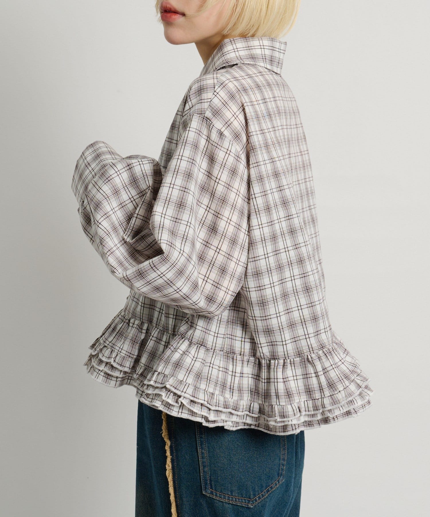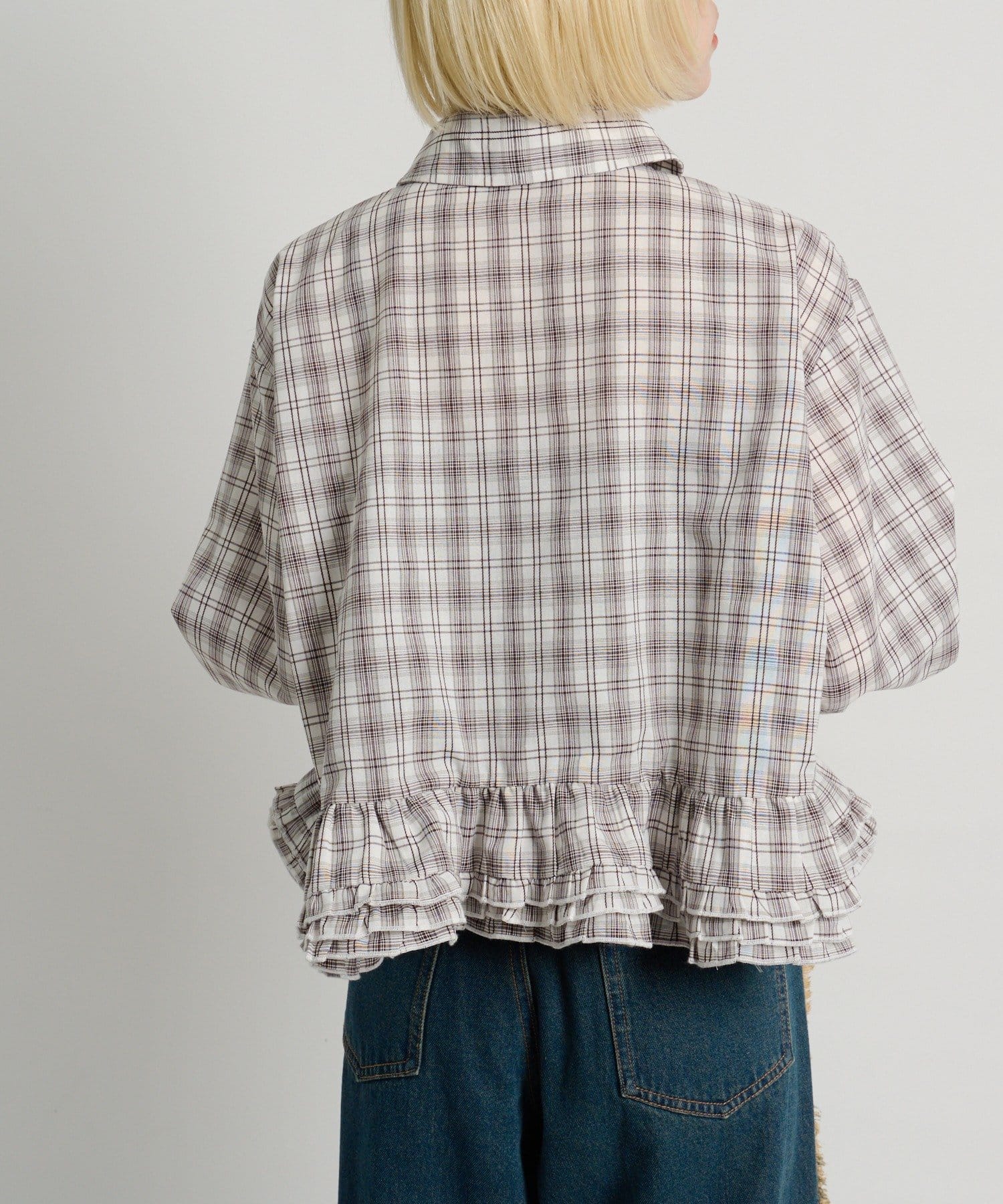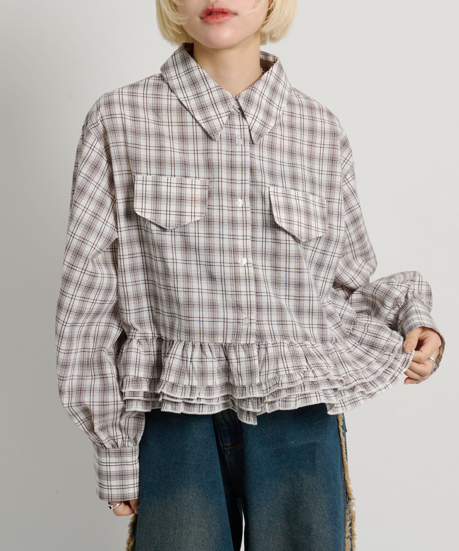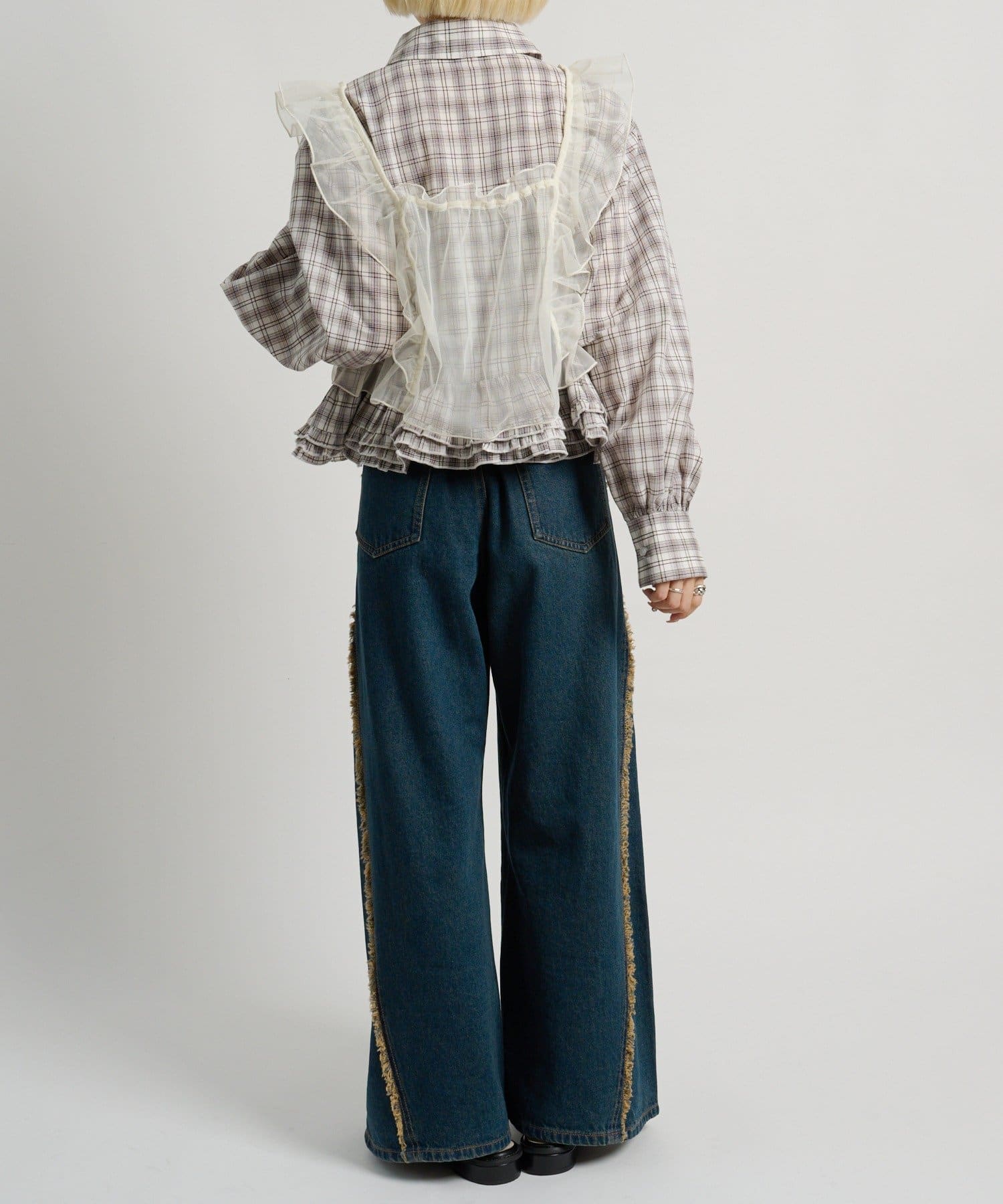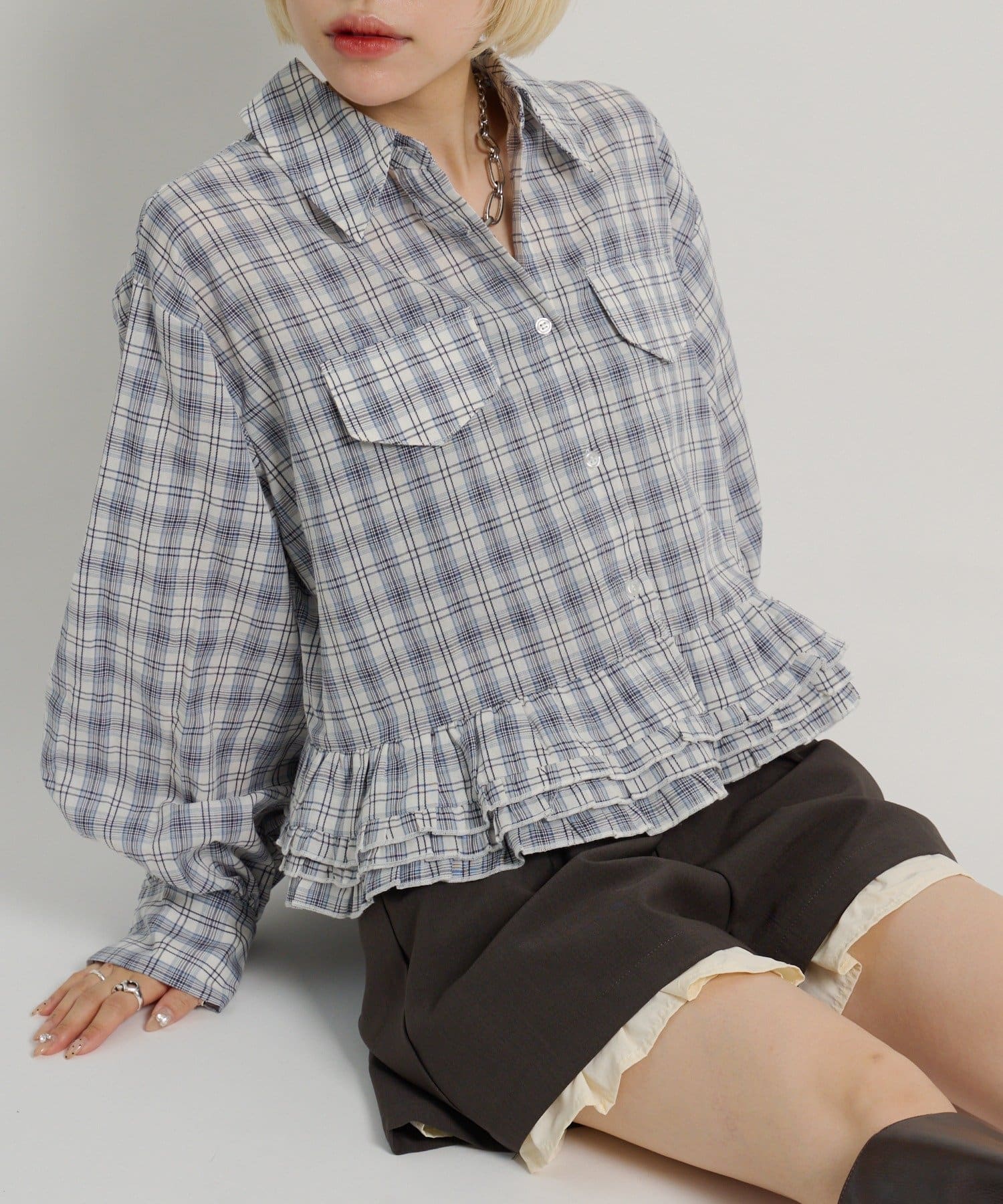 ・裾にあしらったフリルデザインがポイントのチェックシャツ