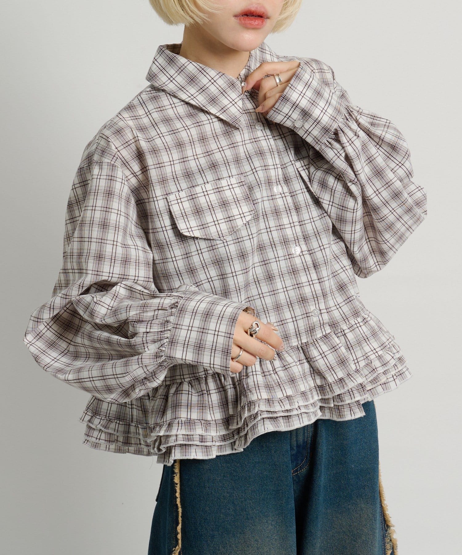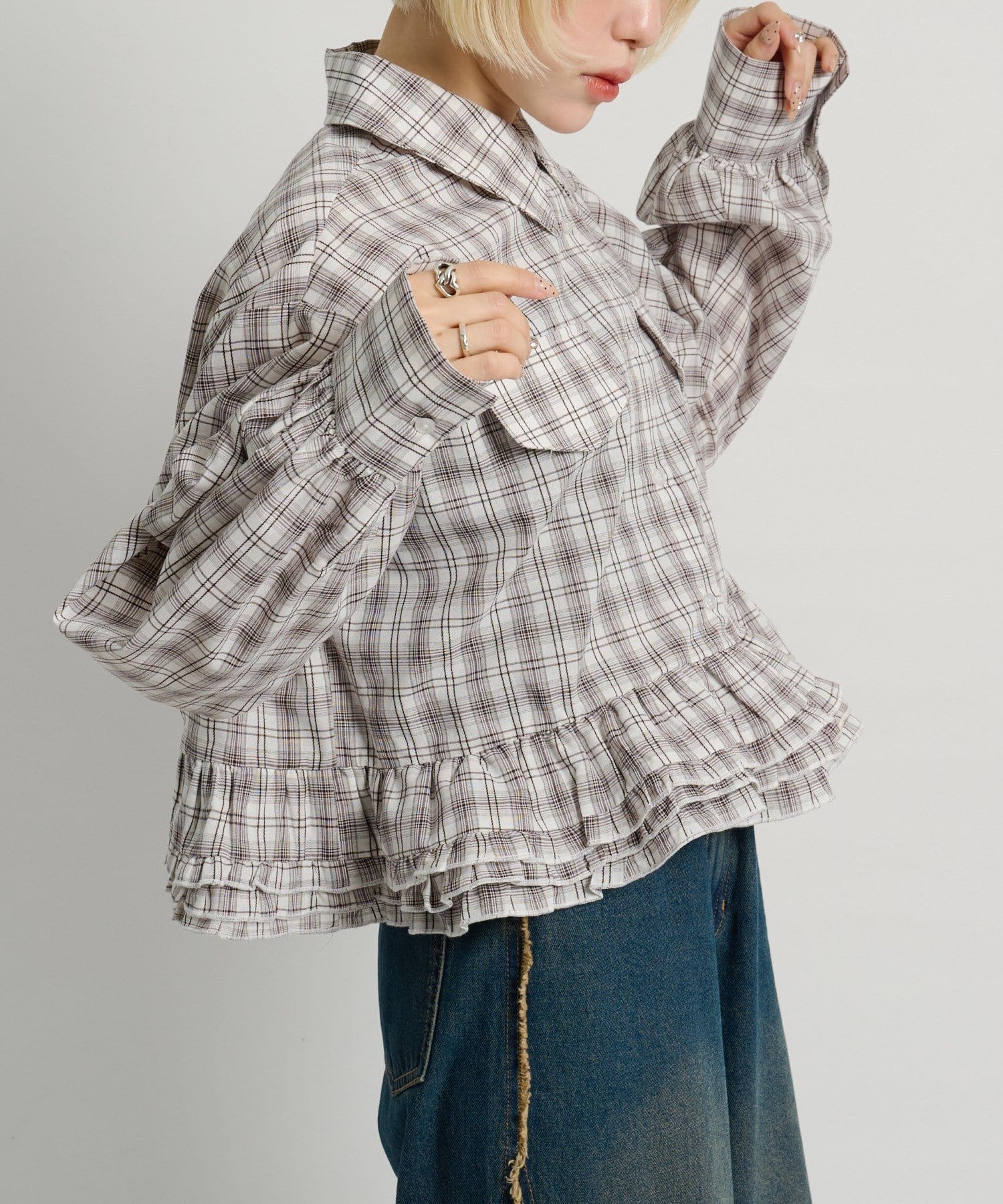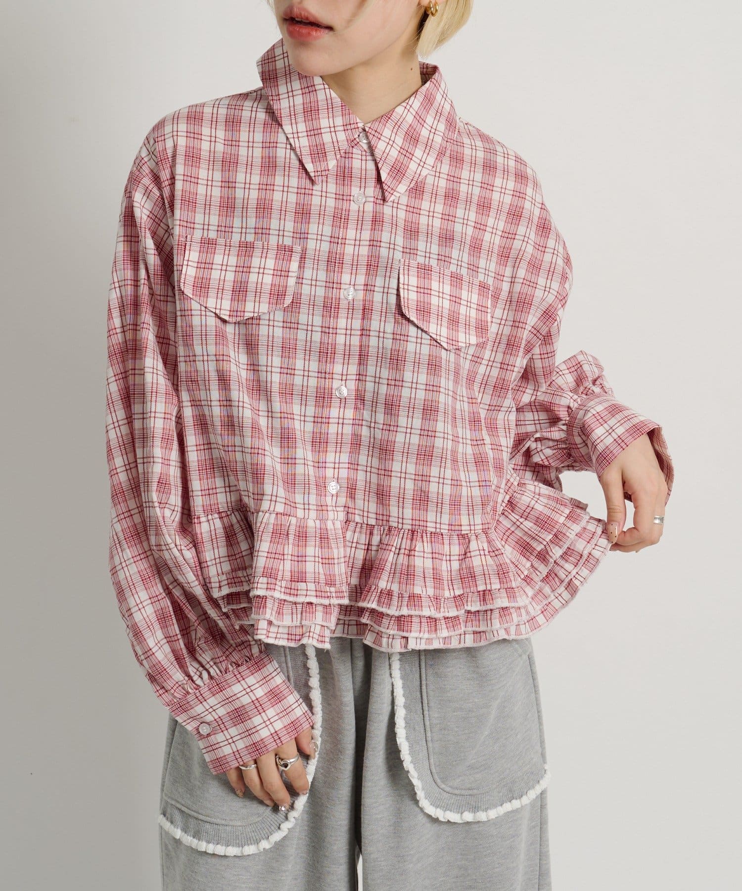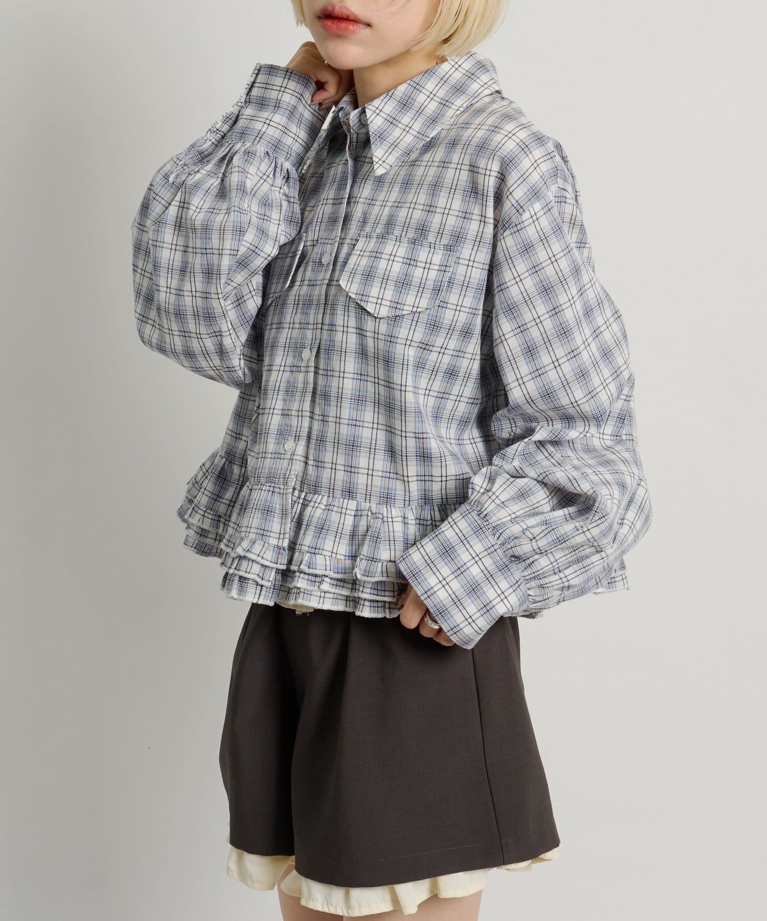 ・裾にあしらったフリルデザインがポイントのチェックシャツ