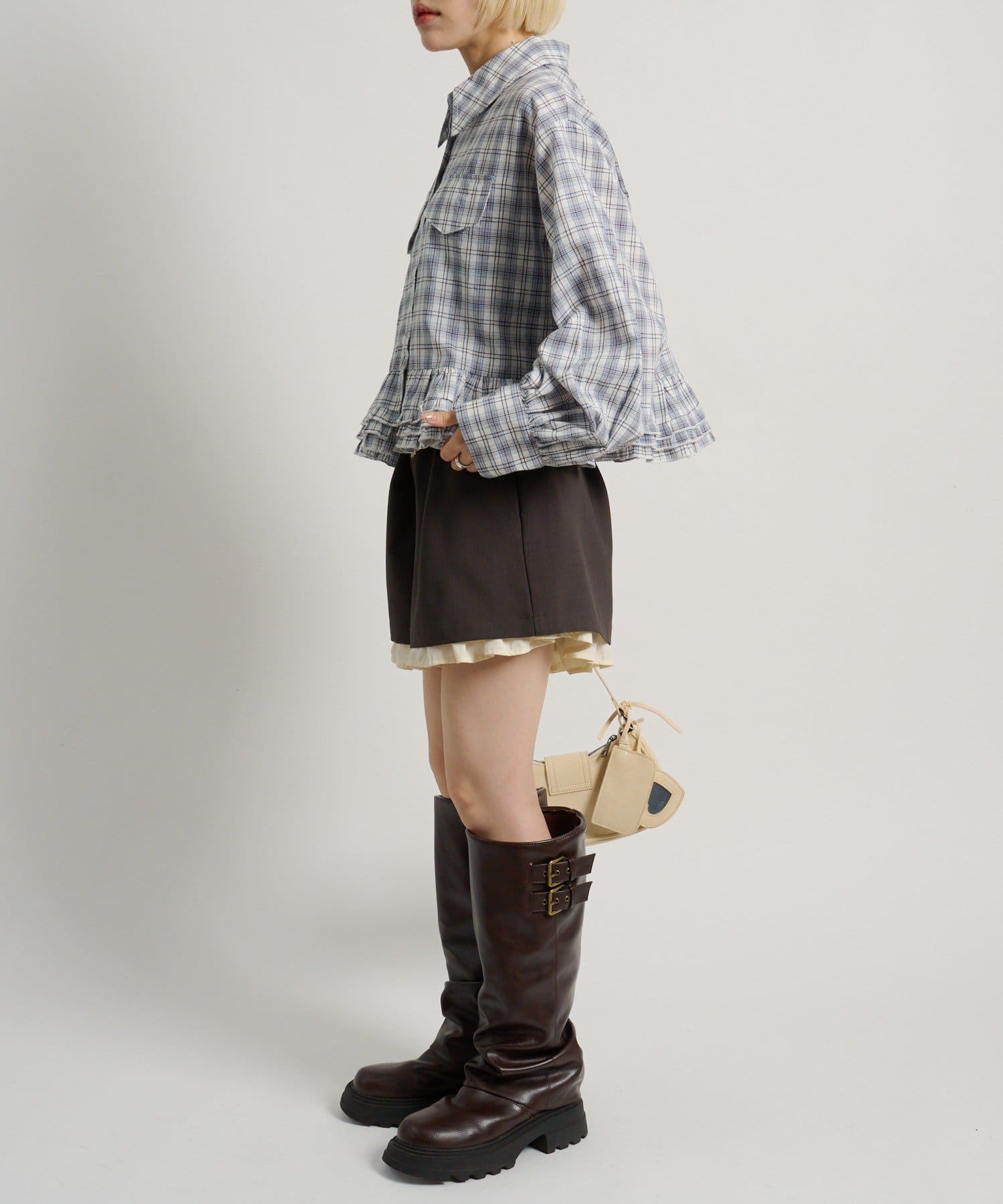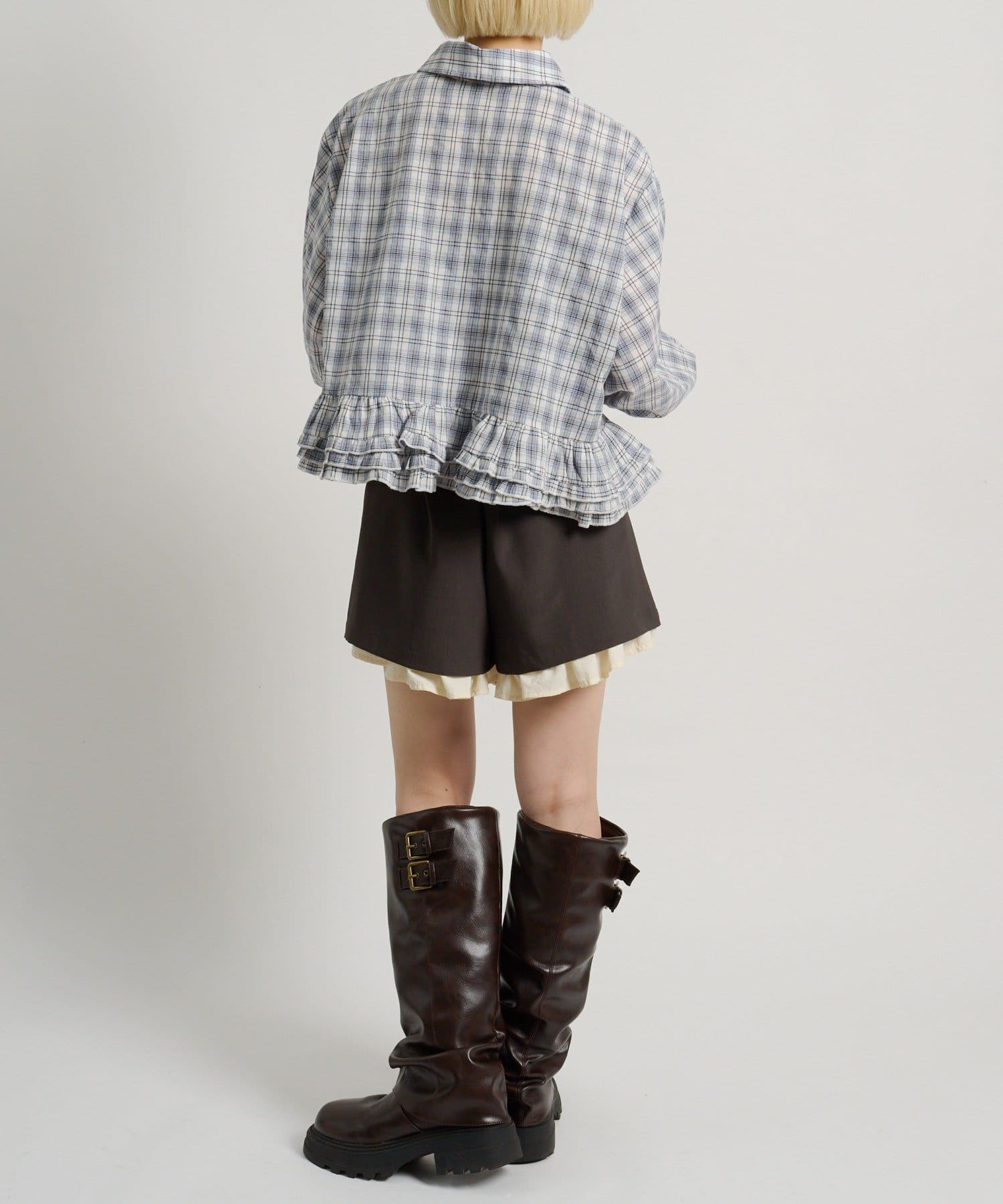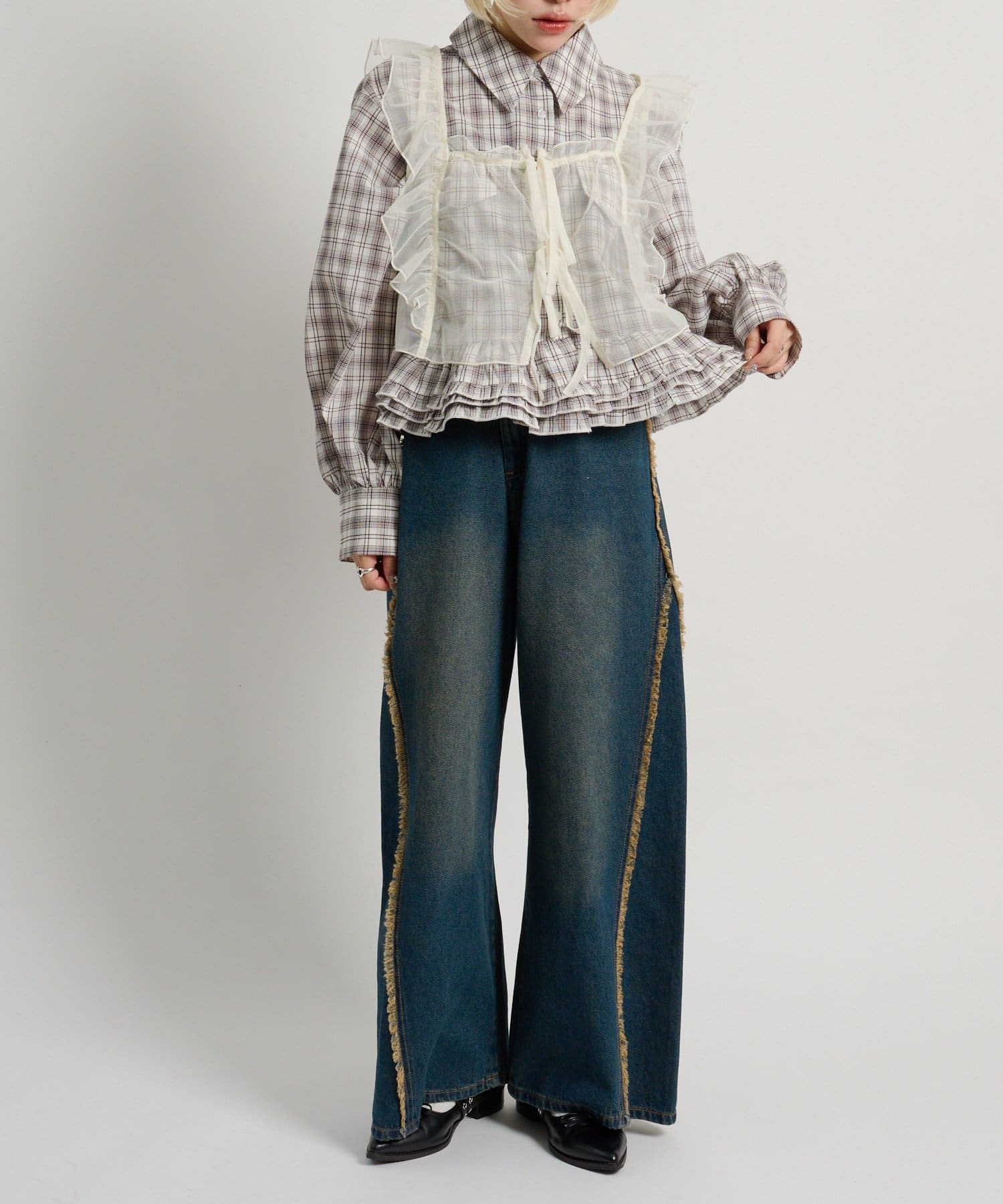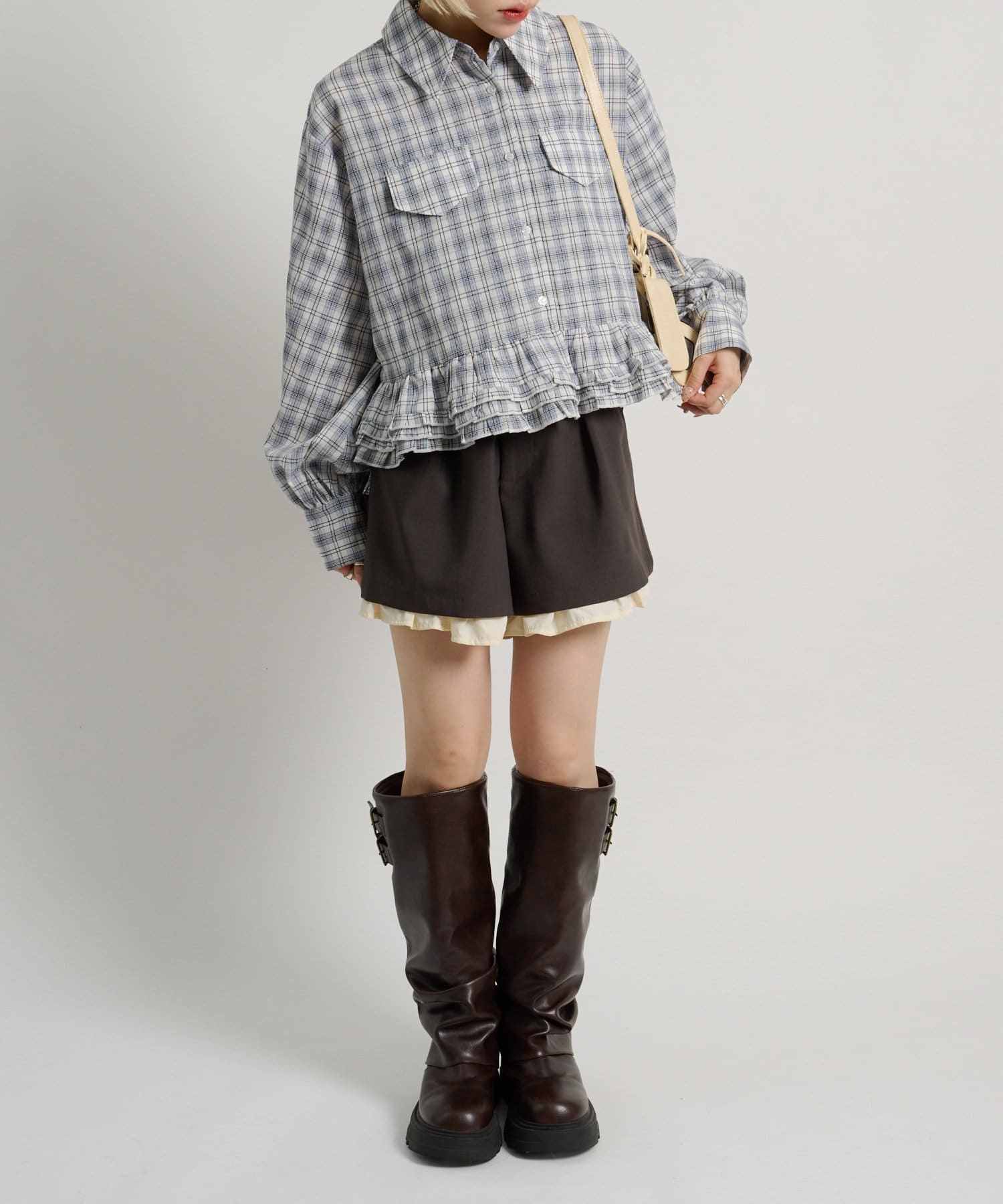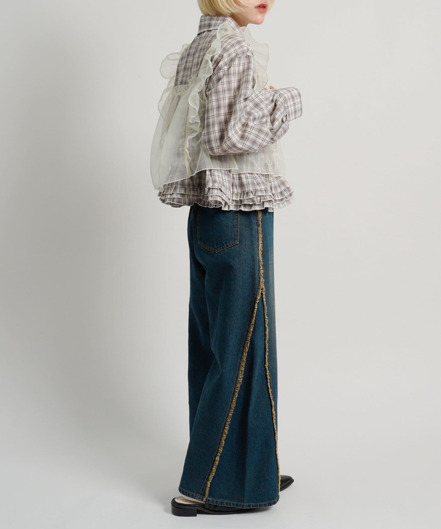 ・裾にあしらったフリルデザインがポイントのチェックシャツ