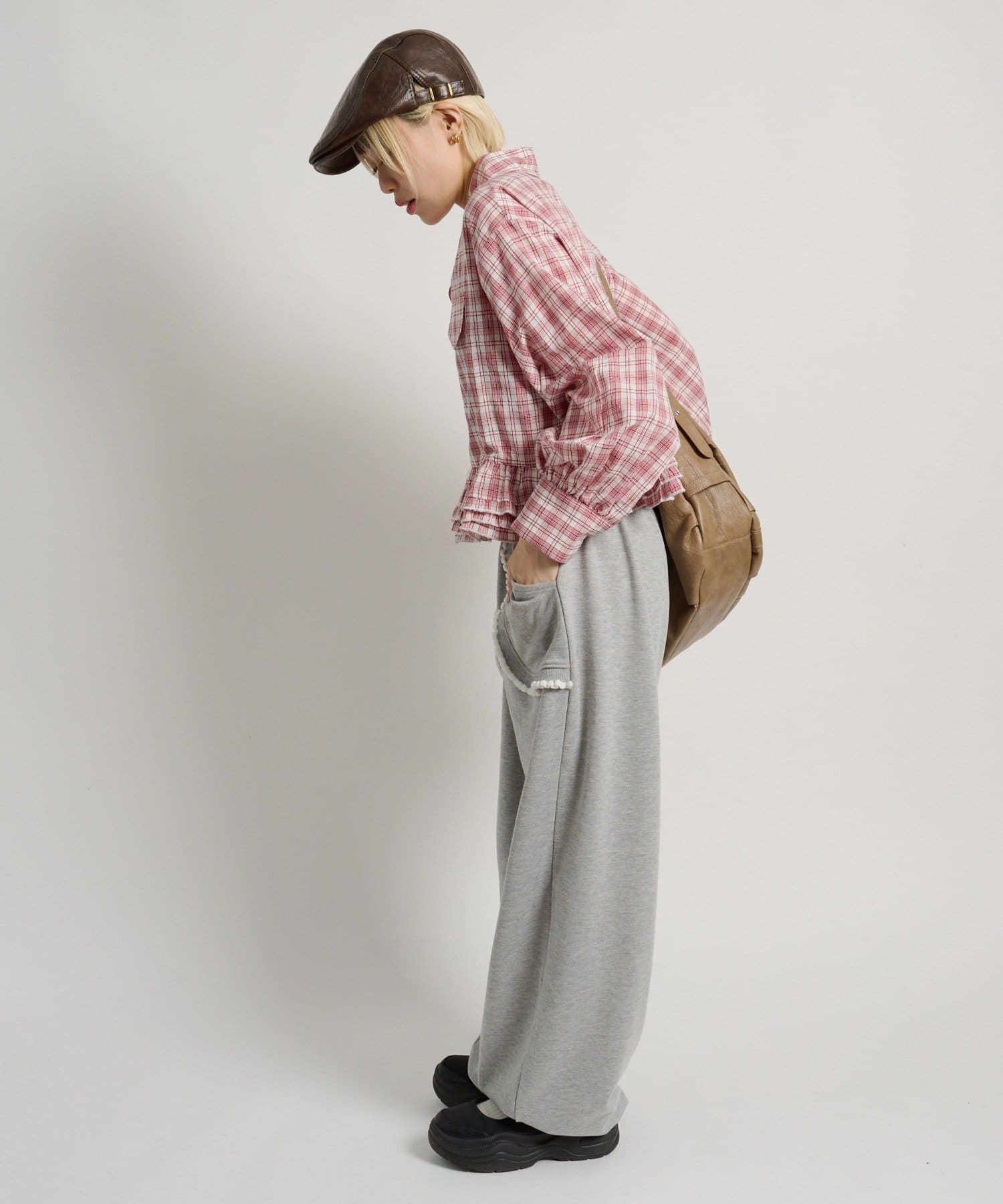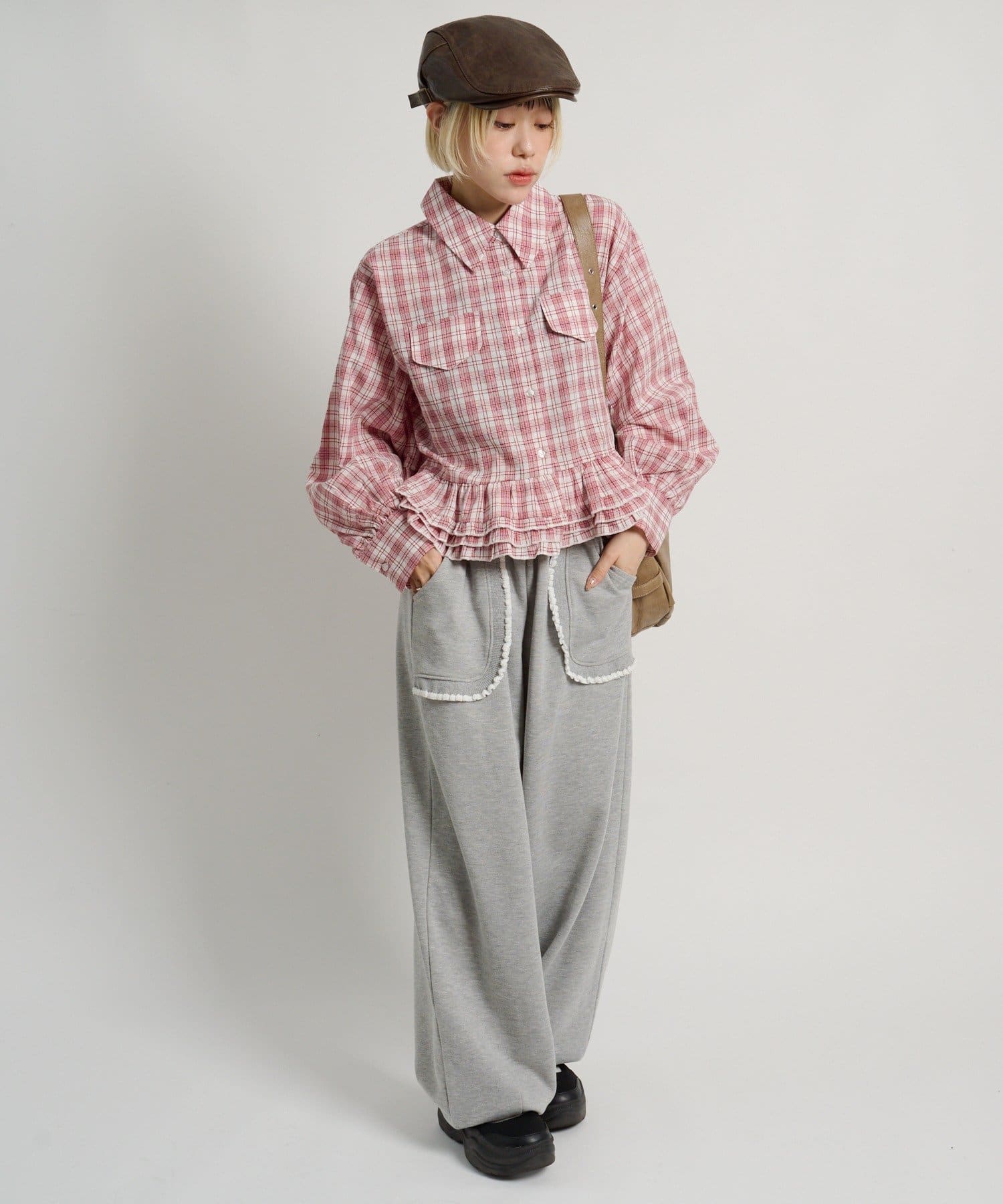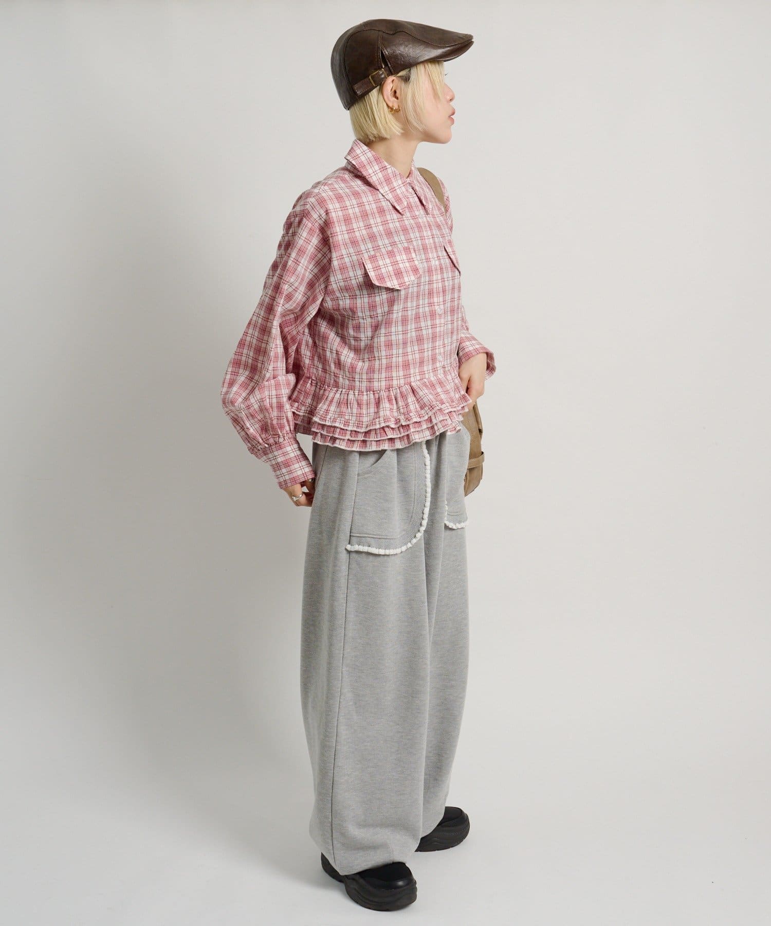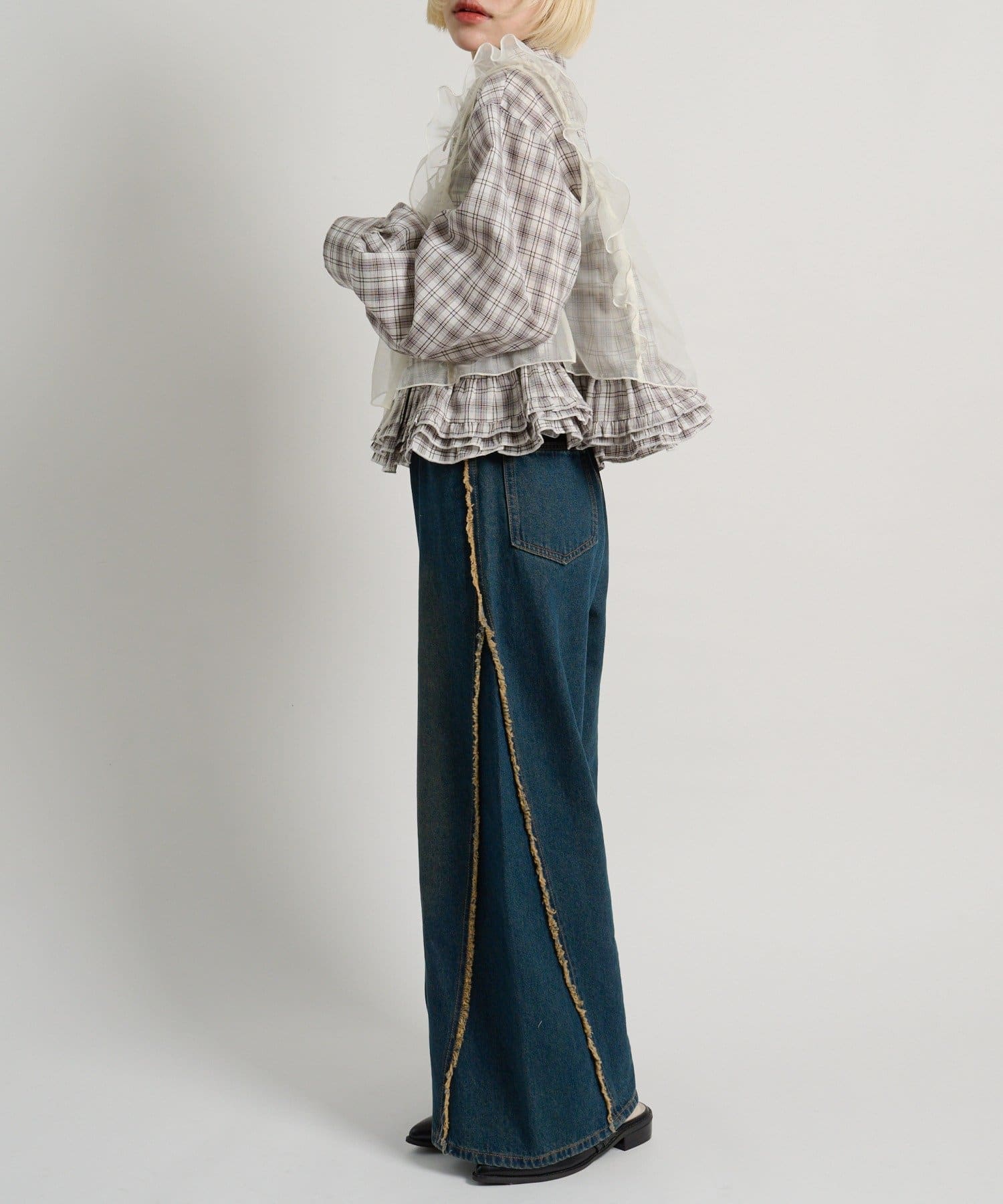 ・裾にあしらったフリルデザインがポイントのチェックシャツ